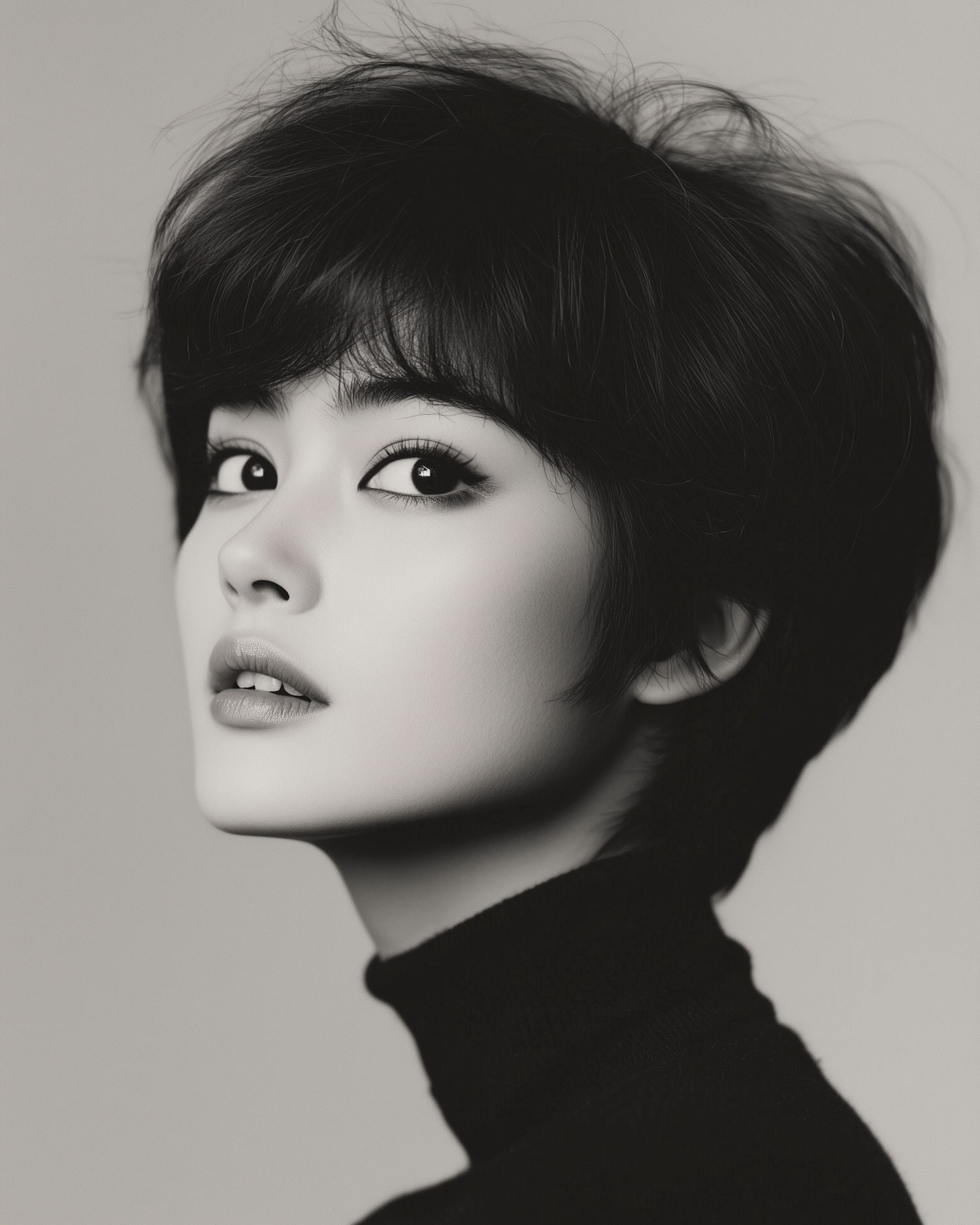 Black and white portrait of a young Asian woman with short dark hair, expressive eyes, and a black turtleneck. Soft lighting enhances her features.