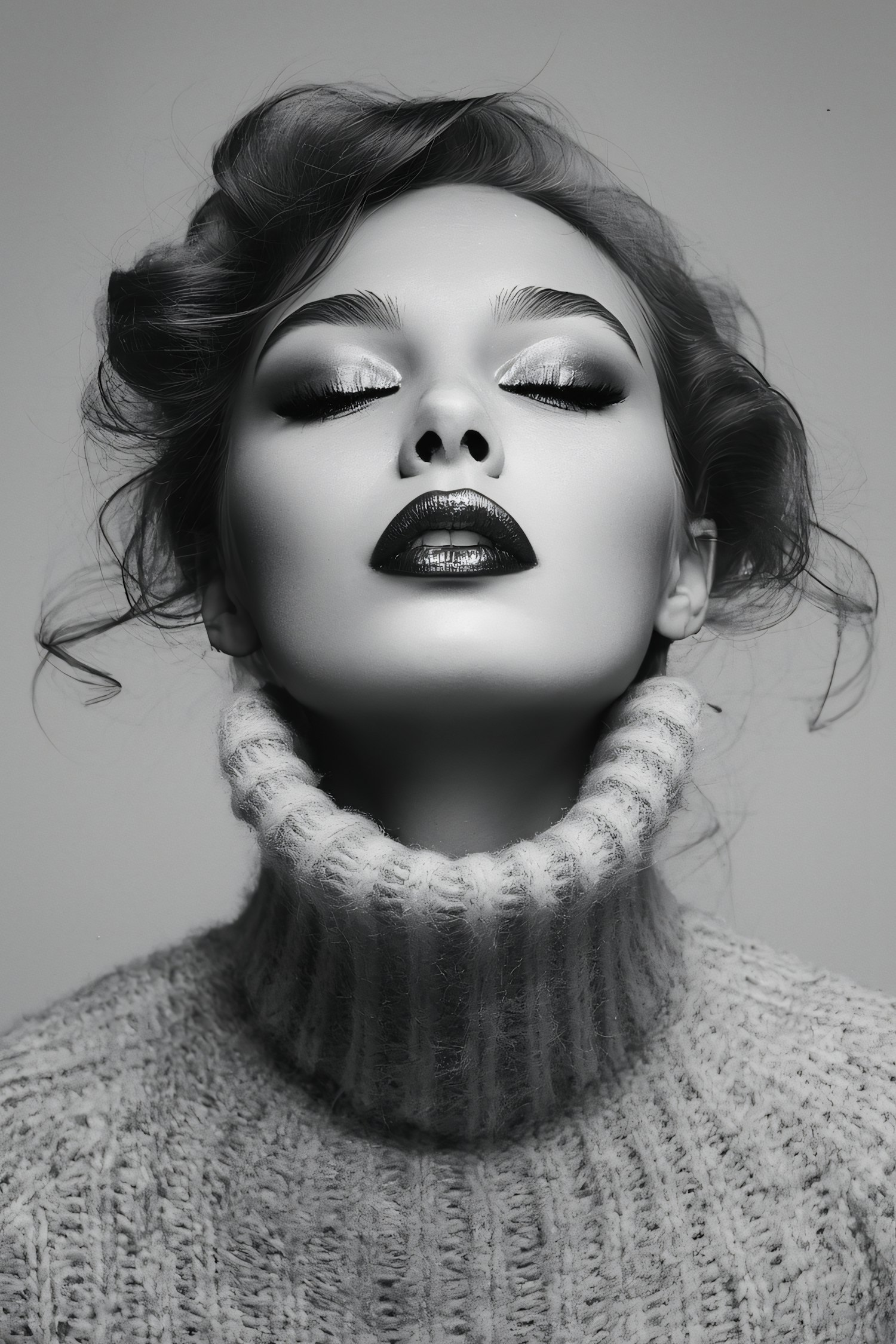 Monochrome portrait of a serene individual with elegant makeup and a textured sweater, showcasing dramatic lighting and artistic composition.