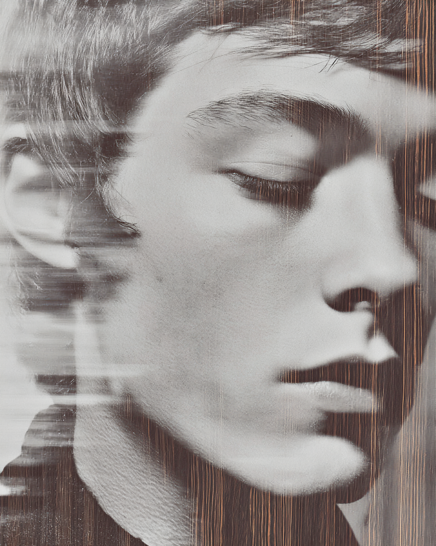 Artistic monochrome portrait of a serene individual with a textured overlay, emphasizing facial contours and a calm expression.