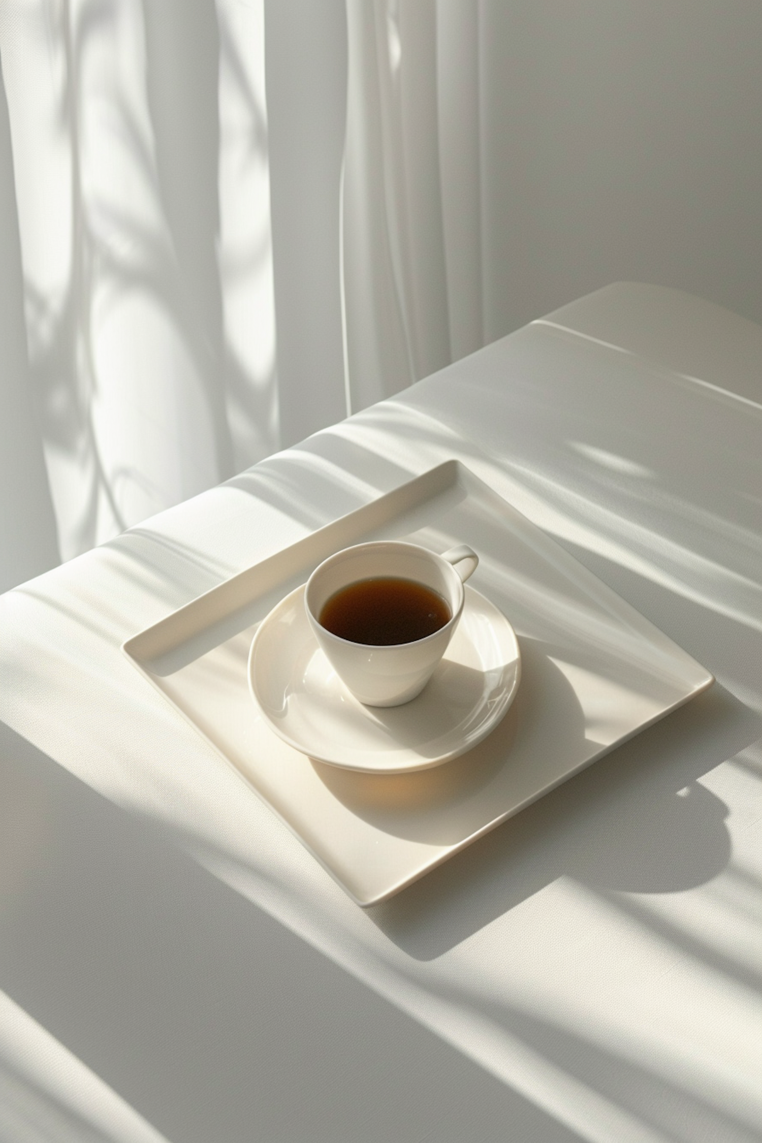 Minimalist white tea cup on saucer with soft shadows, creating a serene and tranquil atmosphere.