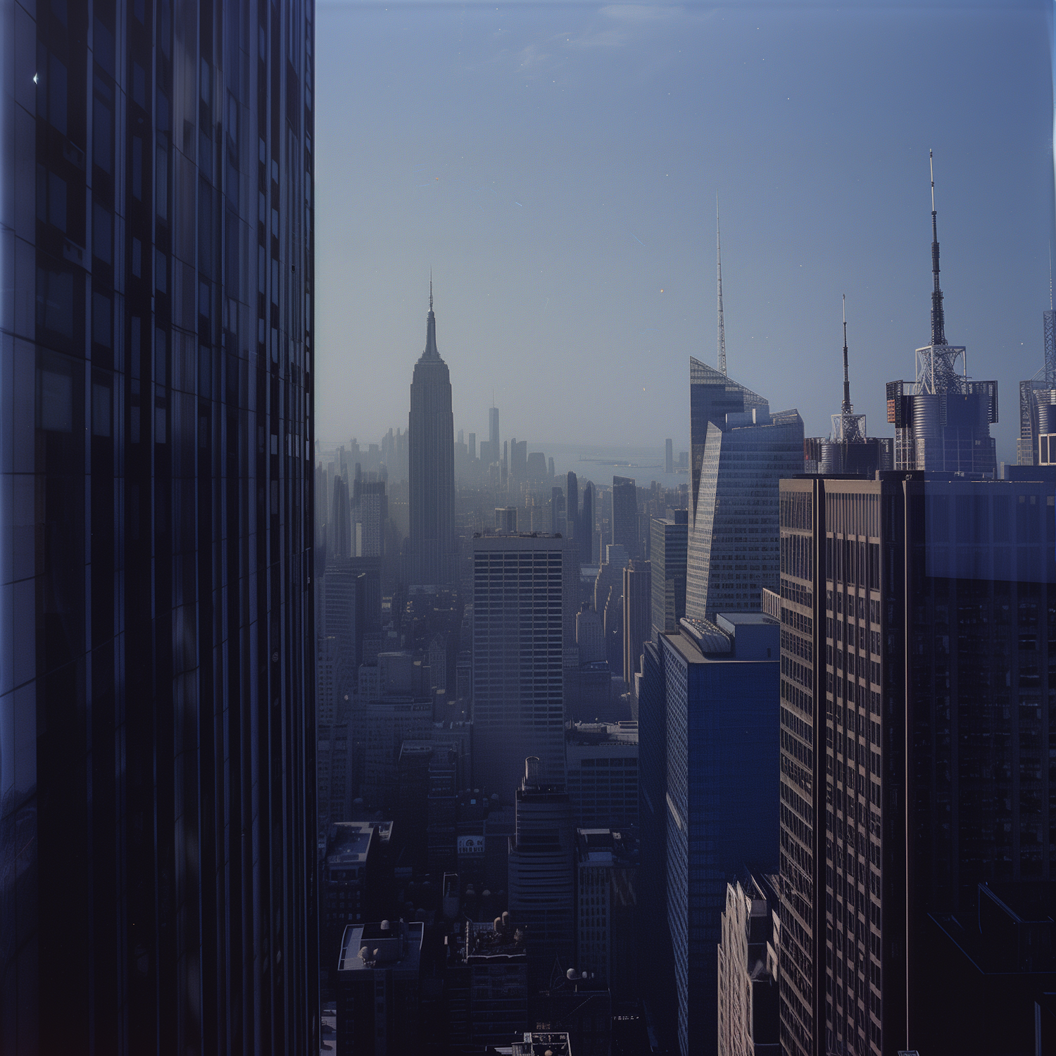 Stunning New York City skyline with the Empire State Building at the center, surrounded by iconic skyscrapers under a clear blue sky.