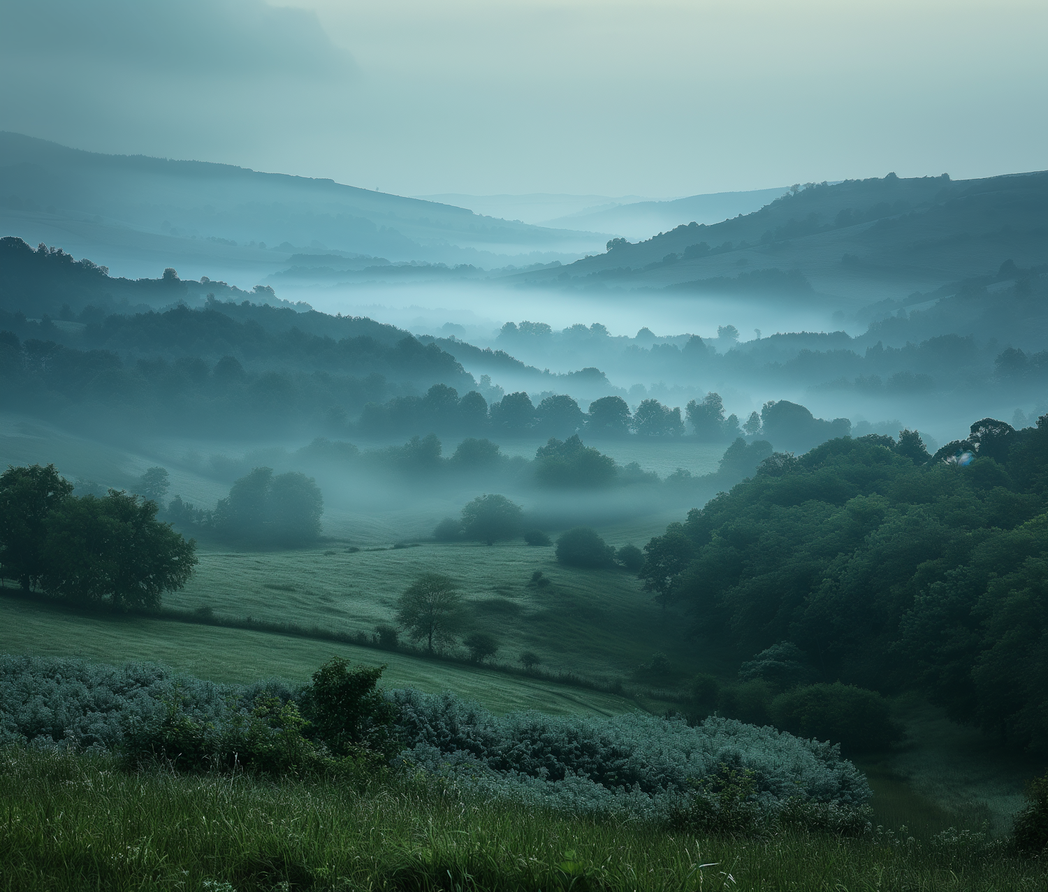 Misty green hills create a serene and ethereal landscape, with layers of trees and fields fading into the distance.