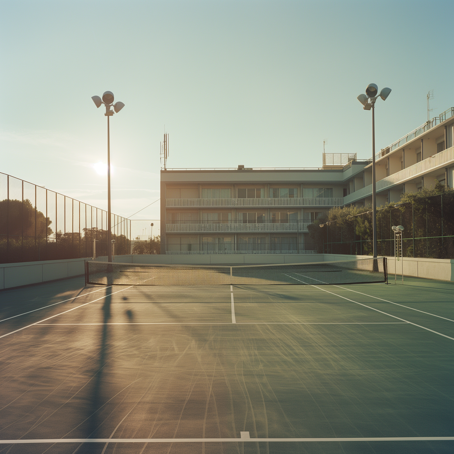 Empty tennis court at sunrise or sunset with soft golden light, surrounded by fences and a modern building in the background.