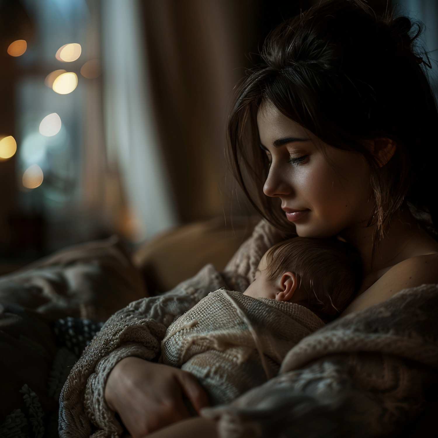 A young woman with dark hair cradles a sleeping baby in a cozy, warmly lit room, creating a serene and intimate atmosphere.