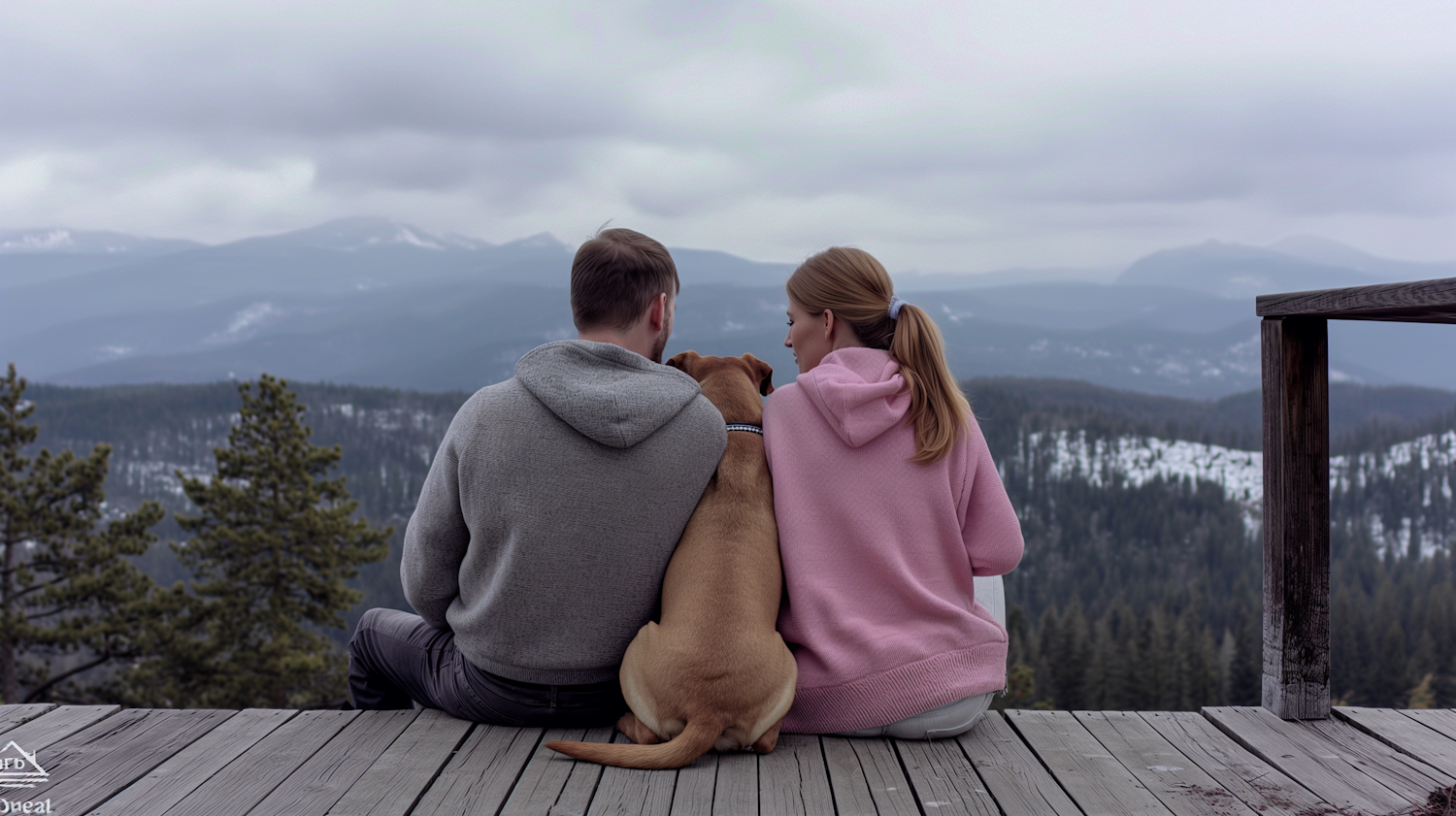 Couple and dog enjoy a serene mountain view from a wooden deck, dressed in cozy hoodies. Overcast sky adds tranquility to the scene.