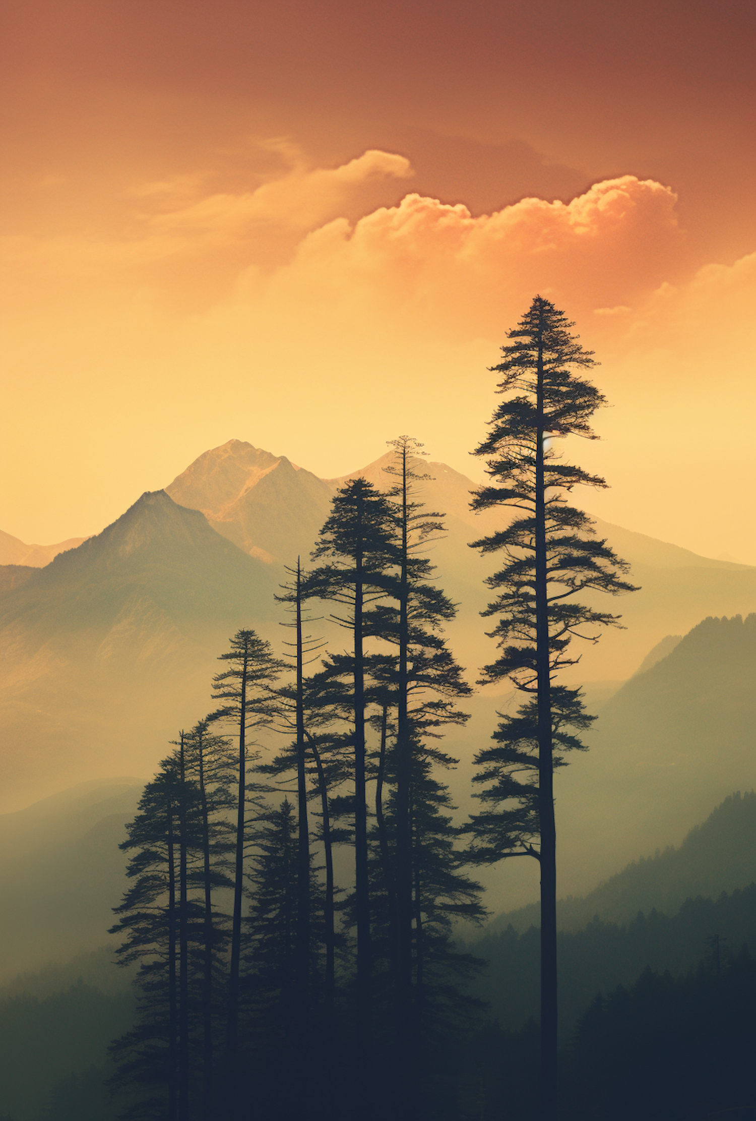 Silhouetted trees against a warm, misty mountain backdrop at sunrise or sunset, creating a serene and tranquil scene.