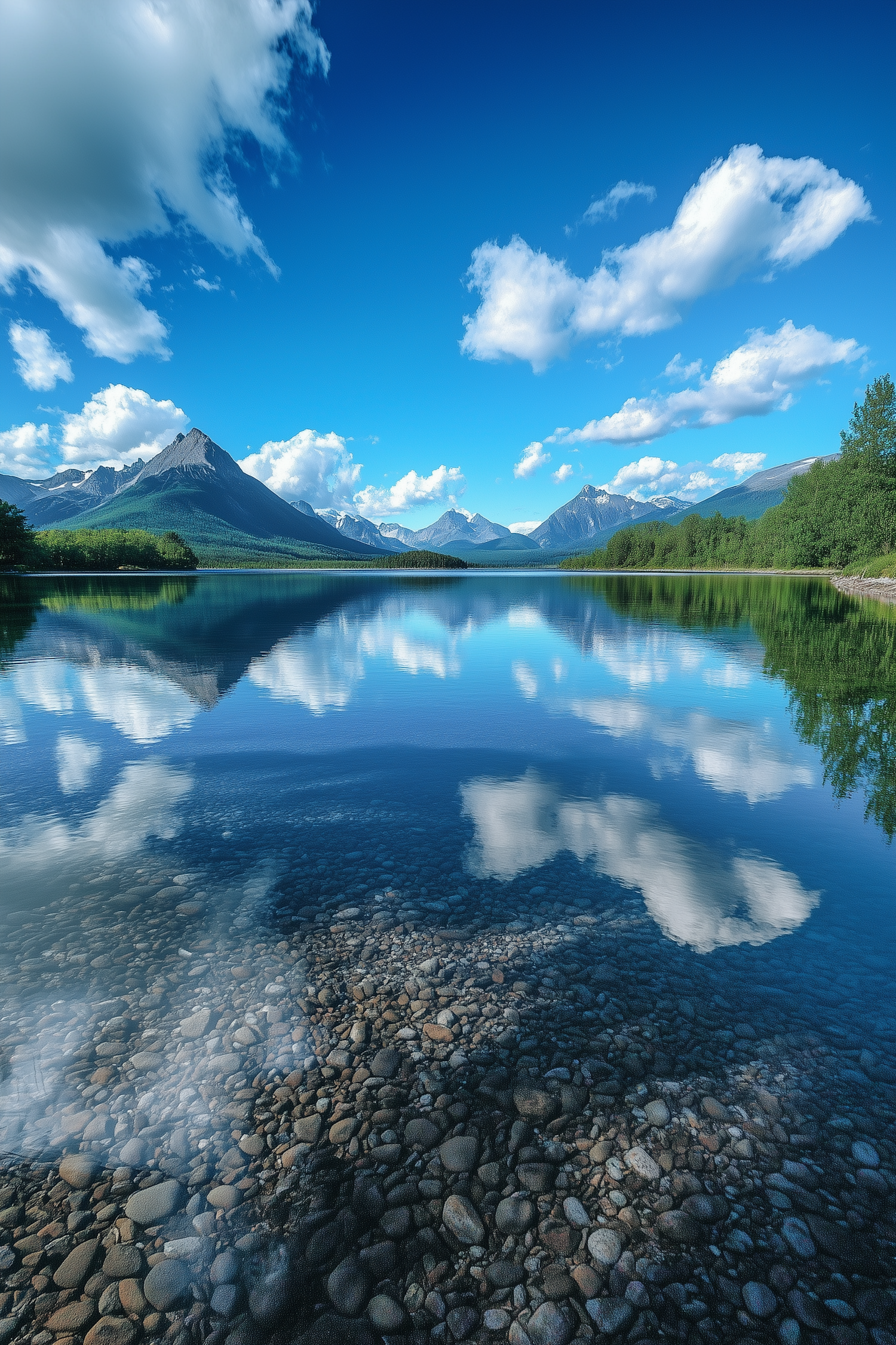 Stunning mountain landscape with clear lake reflections, blue sky, and lush greenery. Perfect for nature lovers and tranquility seekers.
