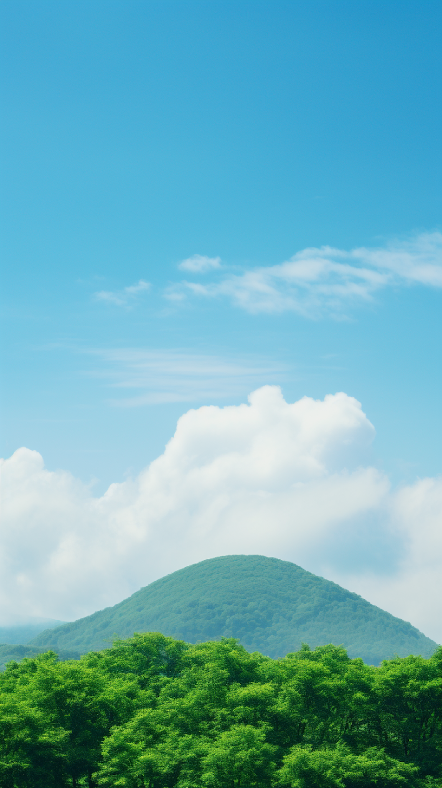 Lush green hill and trees under a bright blue sky with fluffy clouds, creating a serene and tranquil landscape.