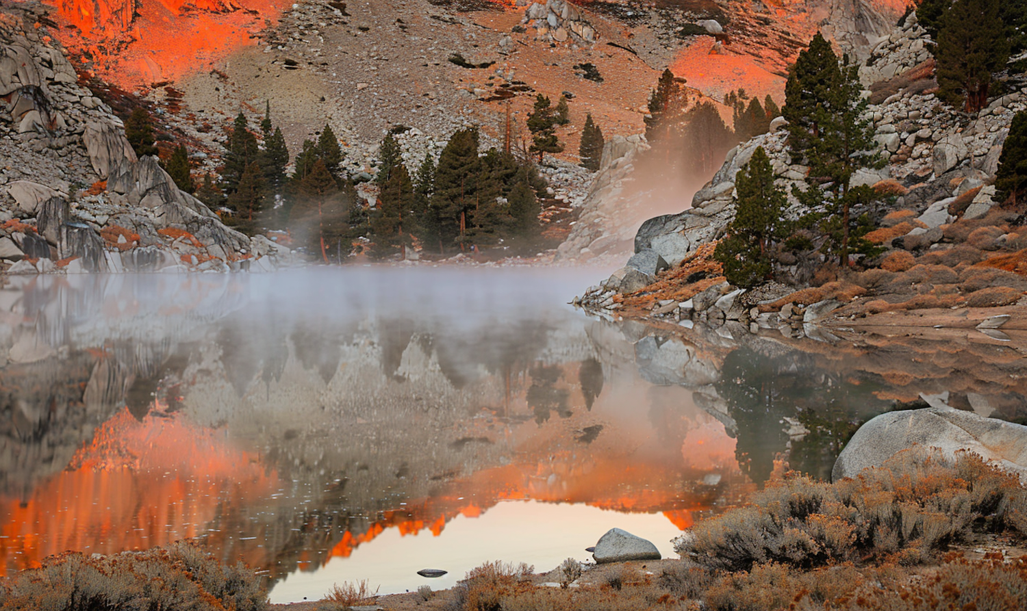 Tranquil mountain lake with mist, reflecting sunlit orange rocks and pine trees, creating a serene and picturesque landscape.