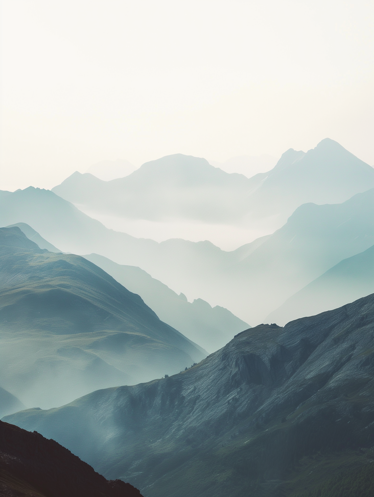 Serene mountain landscape with misty layers and soft hues, creating a tranquil and ethereal atmosphere.