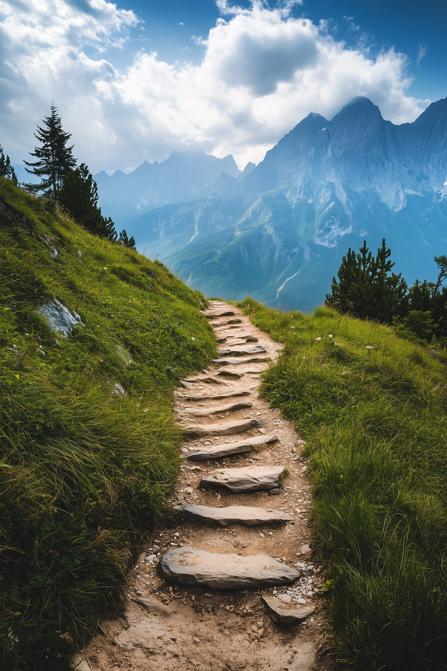 Scenic mountain path with stone steps, lush greenery, and majestic peaks under a cloudy sky, perfect for nature lovers and adventurers.