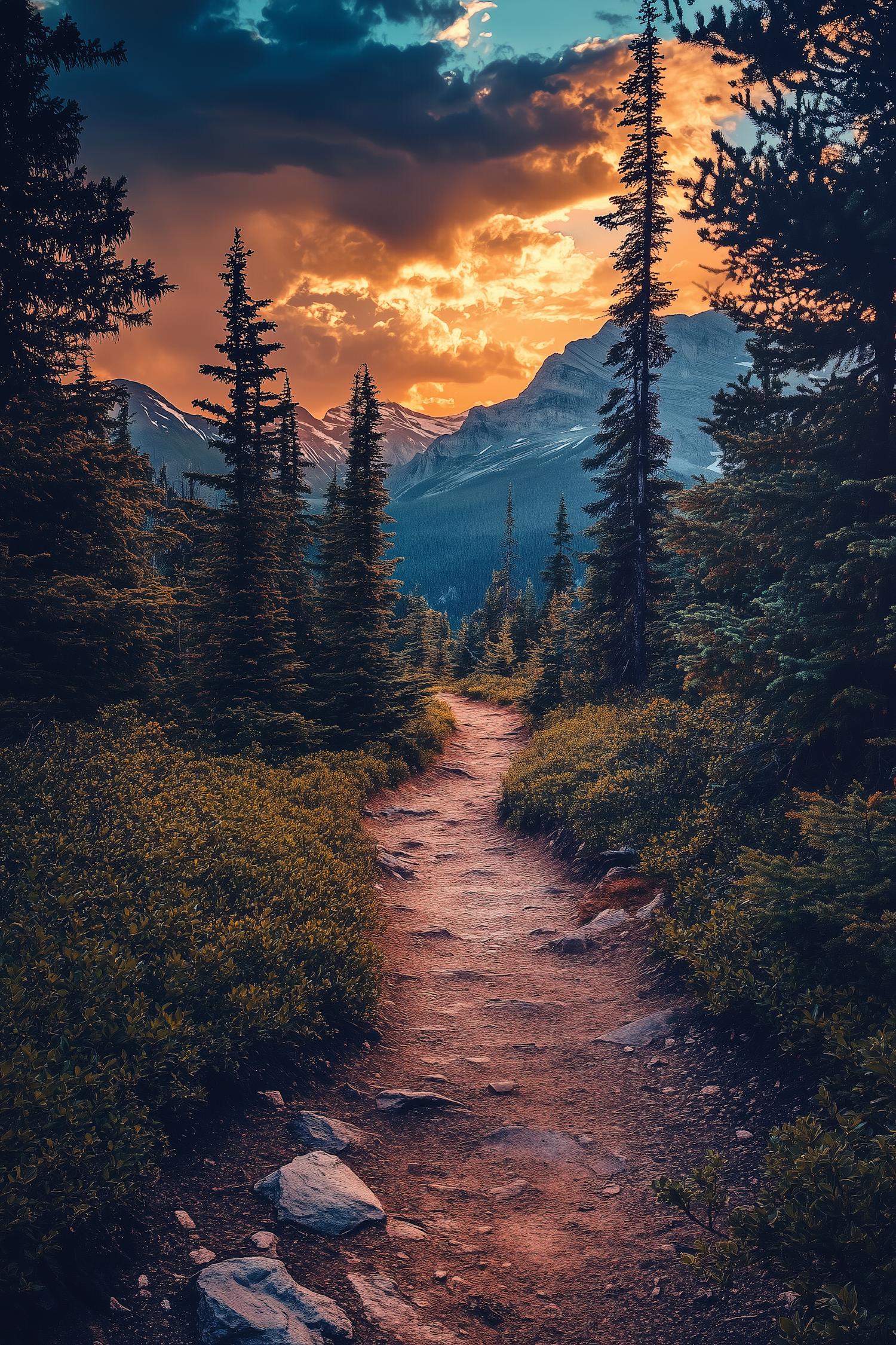 A scenic forest path with towering evergreens, rocky trail, and a stunning sunset over snow-capped mountains.