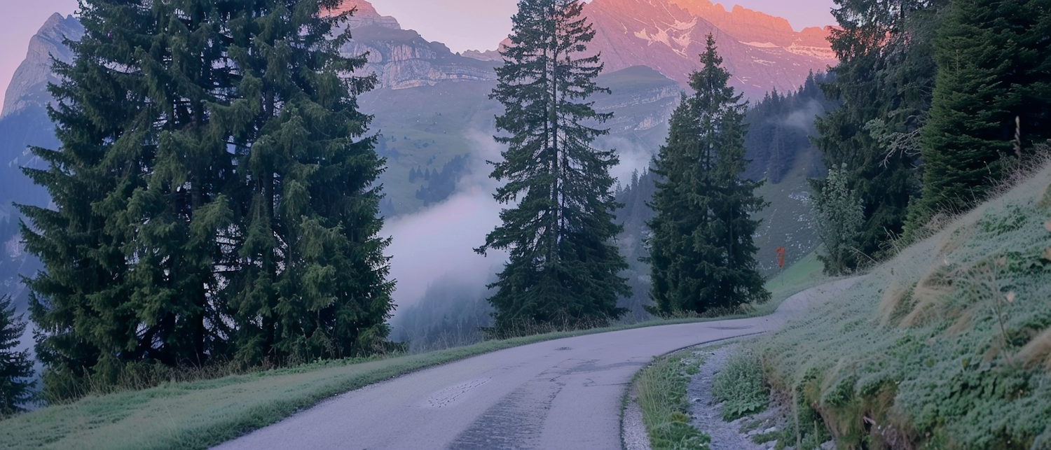 Serene mountain road with lush evergreens and misty fog, set against pink-hued peaks at sunrise or sunset.