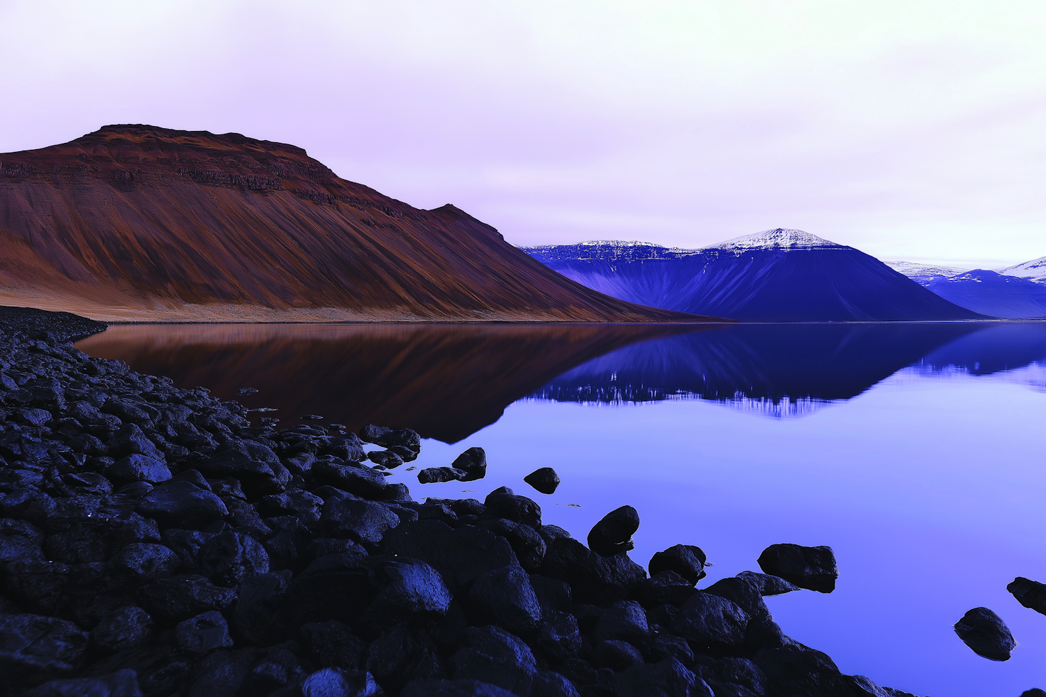 Serene lake with mirror-like reflections of reddish-brown mountains and snow-capped peaks under an overcast sky.