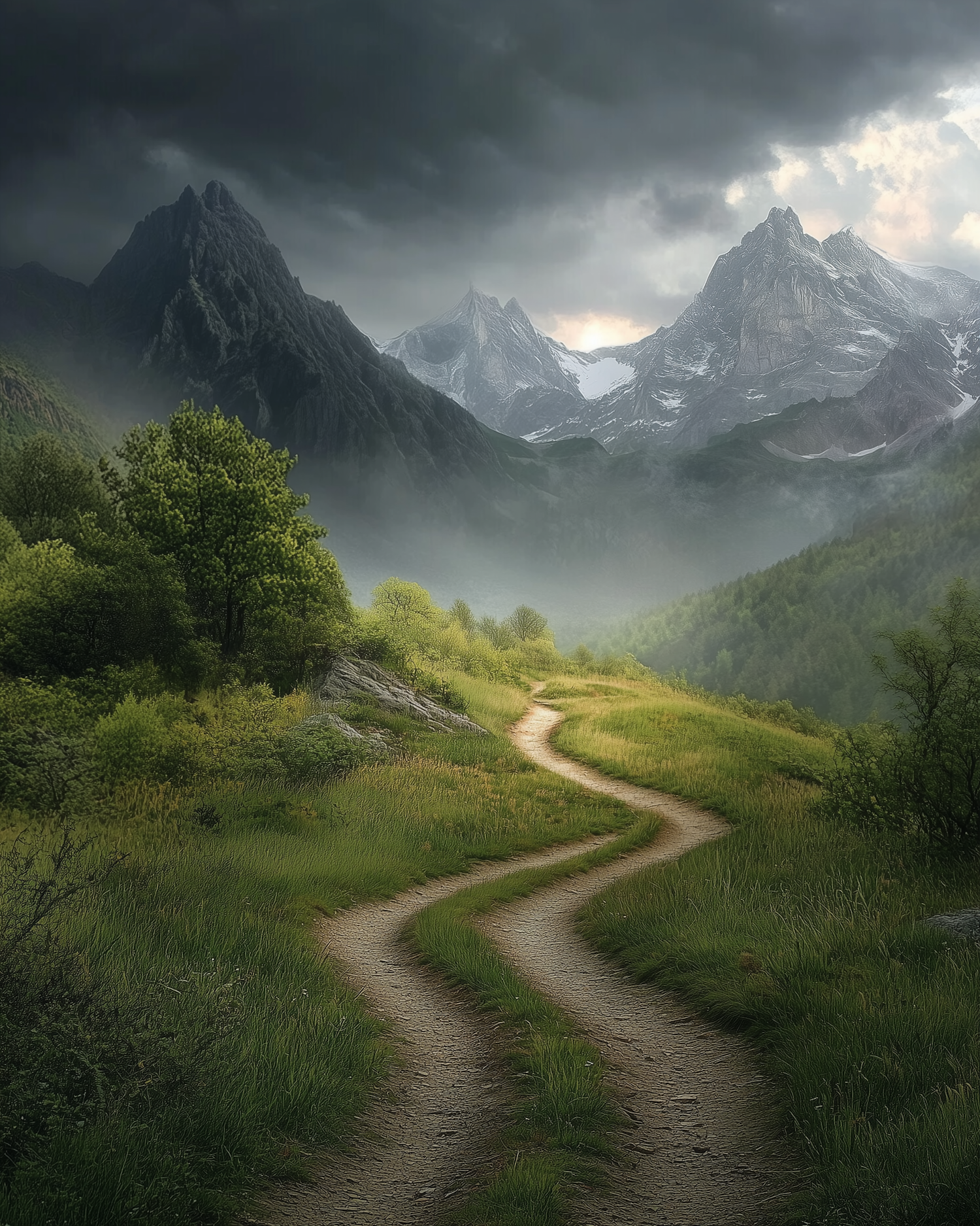 A winding path through lush greenery leads to misty, jagged mountains under dramatic storm clouds.