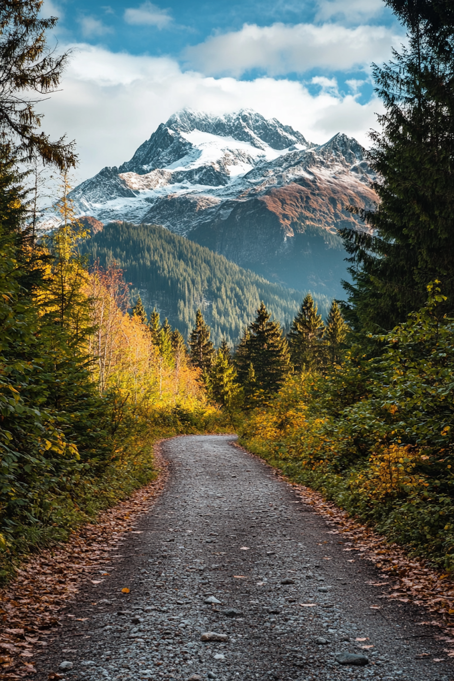 A gravel path through a forest leads to a snow-capped mountain under a blue sky, surrounded by autumn foliage and evergreen trees.