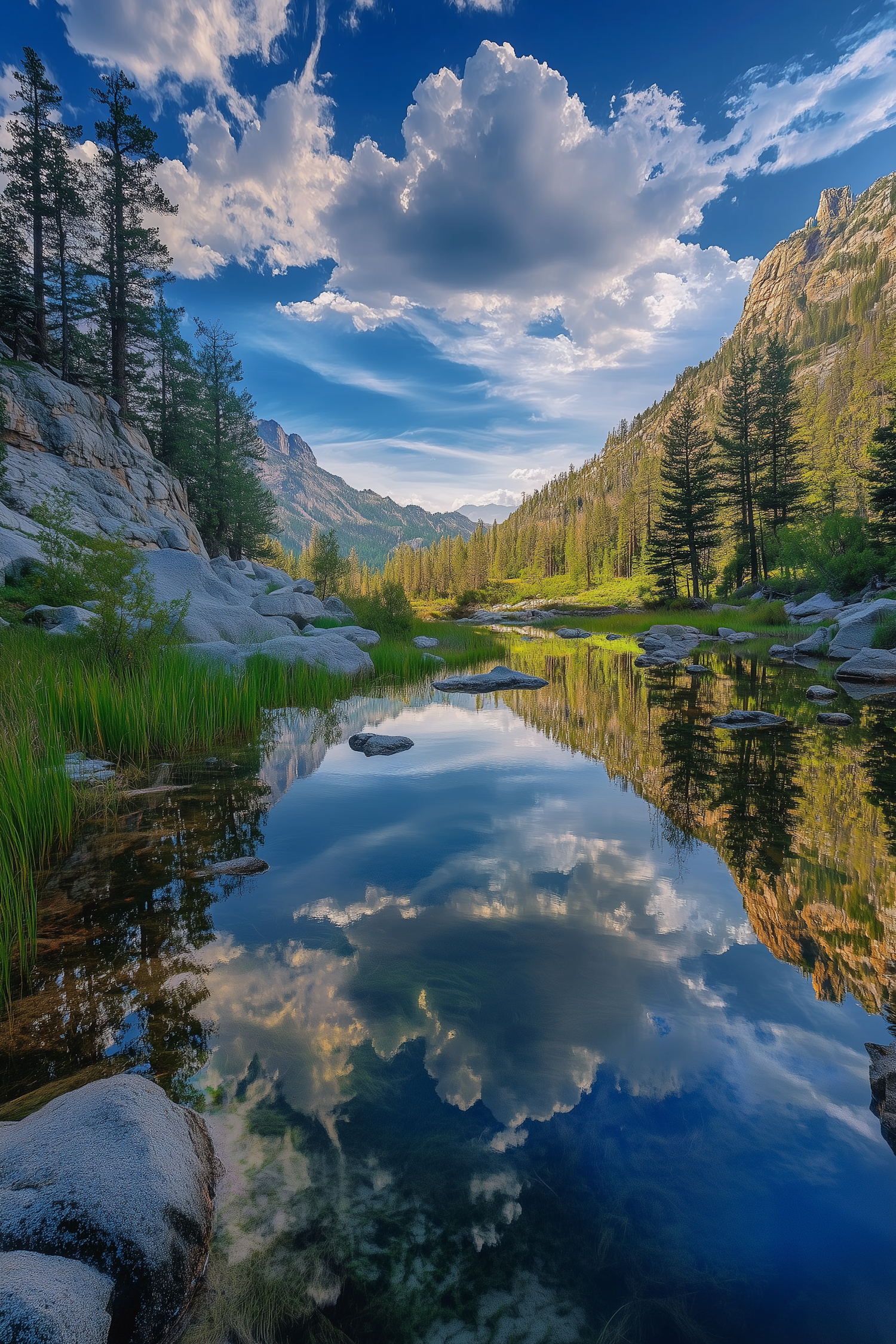 Stunning mountain landscape with a reflective lake, lush greenery, and dramatic clouds under a clear blue sky.