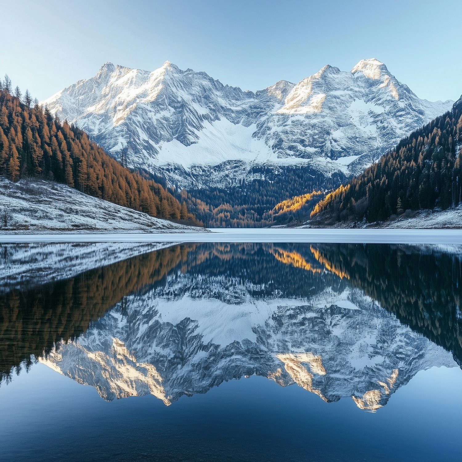 Snowy mountains reflected in a calm lake, surrounded by autumnal and evergreen trees under a clear blue sky. A serene natural scene.