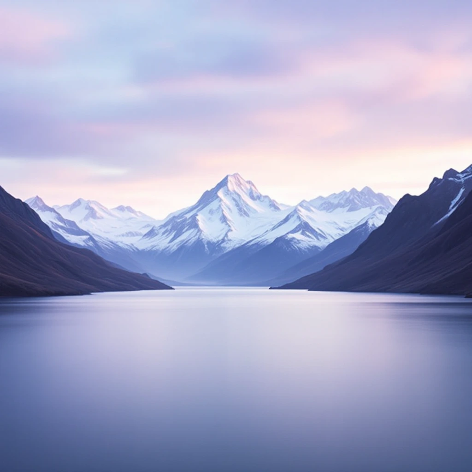 Tranquil lake with snow-capped mountains and pastel sky, creating a serene and ethereal landscape.