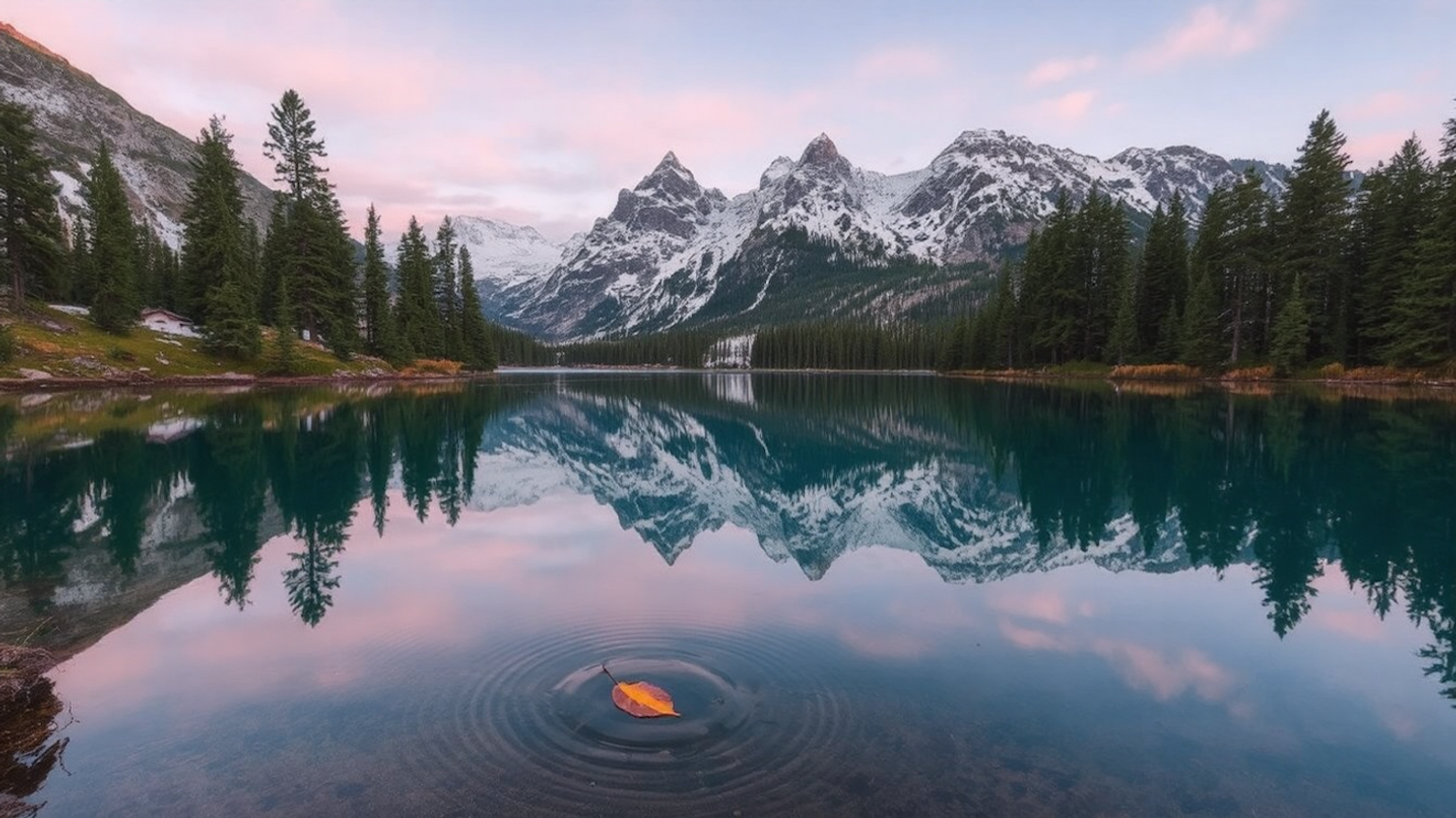 Tranquil mountain lake with snow-capped peaks and a floating leaf, reflecting serene pink and blue skies.