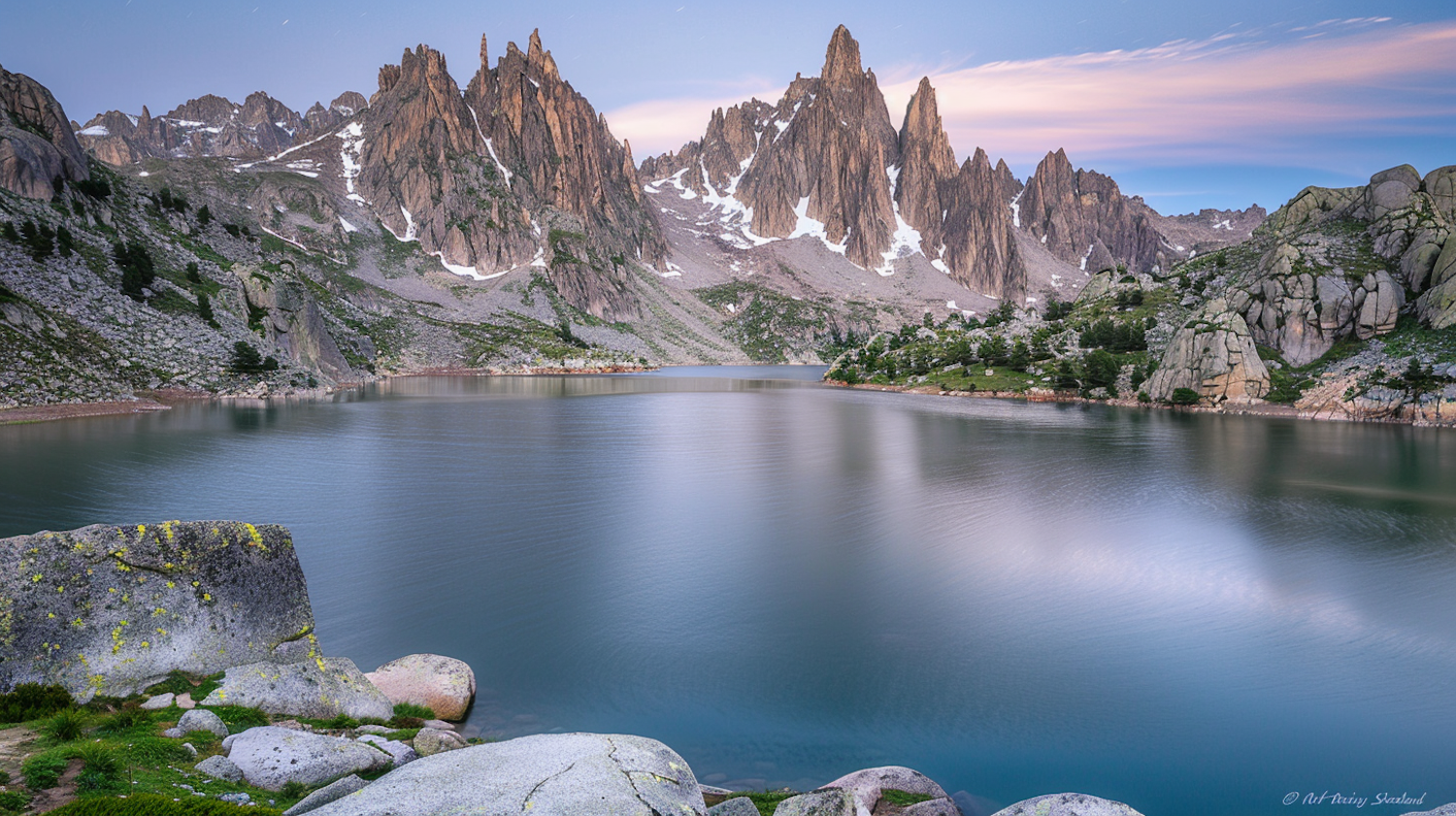 Stunning mountain landscape with jagged peaks, a tranquil lake, and a colorful sunset sky. Perfect for nature and travel enthusiasts.