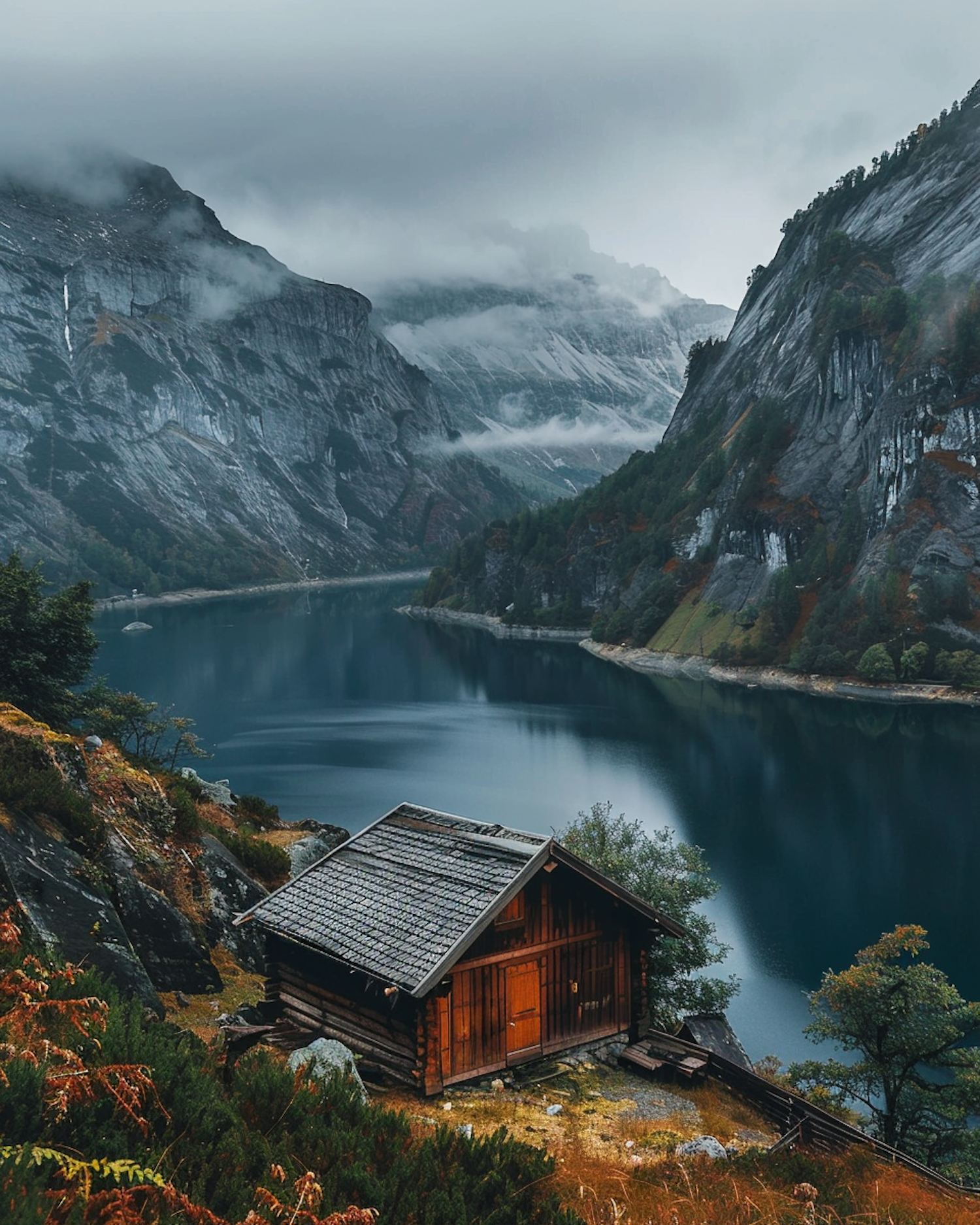 Rustic cabin by a serene lake, surrounded by misty mountains and autumn foliage, creating a tranquil and mystical atmosphere.