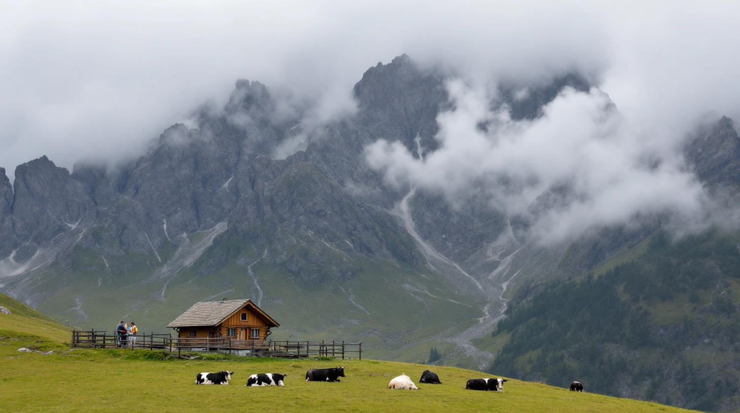 Idyllic mountain scene with a wooden cabin, grazing cows, and misty peaks in the background.