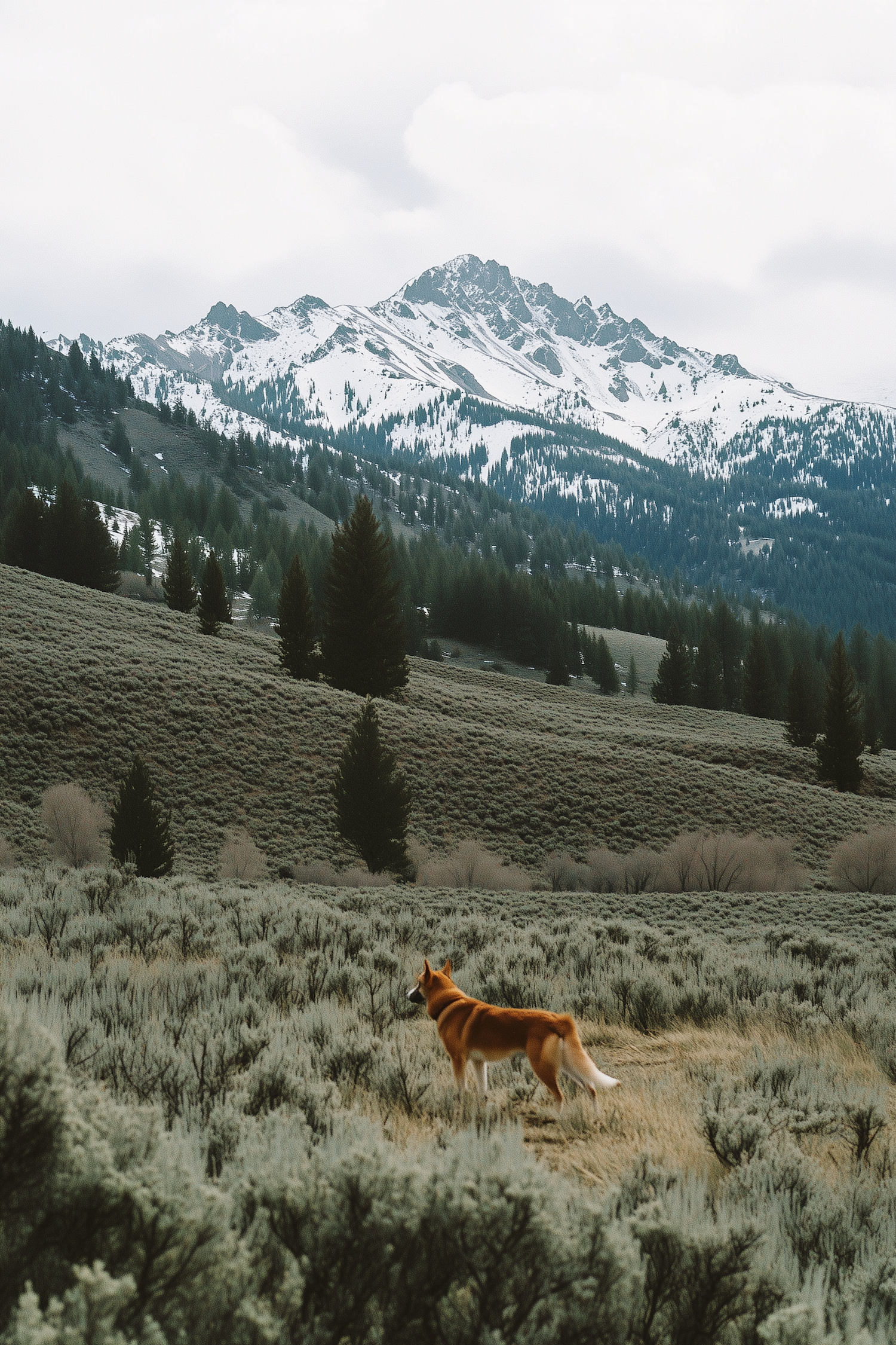 Dog stands in sagebrush field with snow-capped mountains in the background, under a cloudy sky. Scenic and serene landscape.