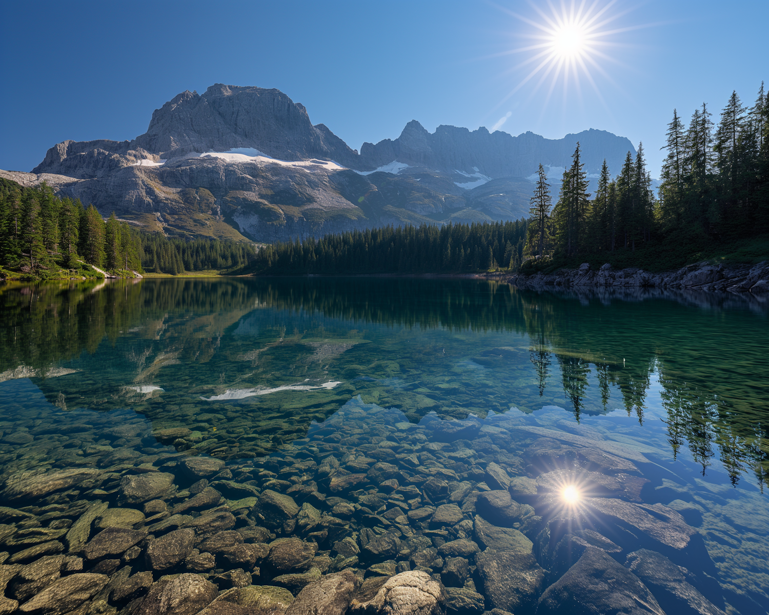 Stunning mountain landscape with a clear lake, evergreen trees, and a bright sunburst in a serene natural setting.