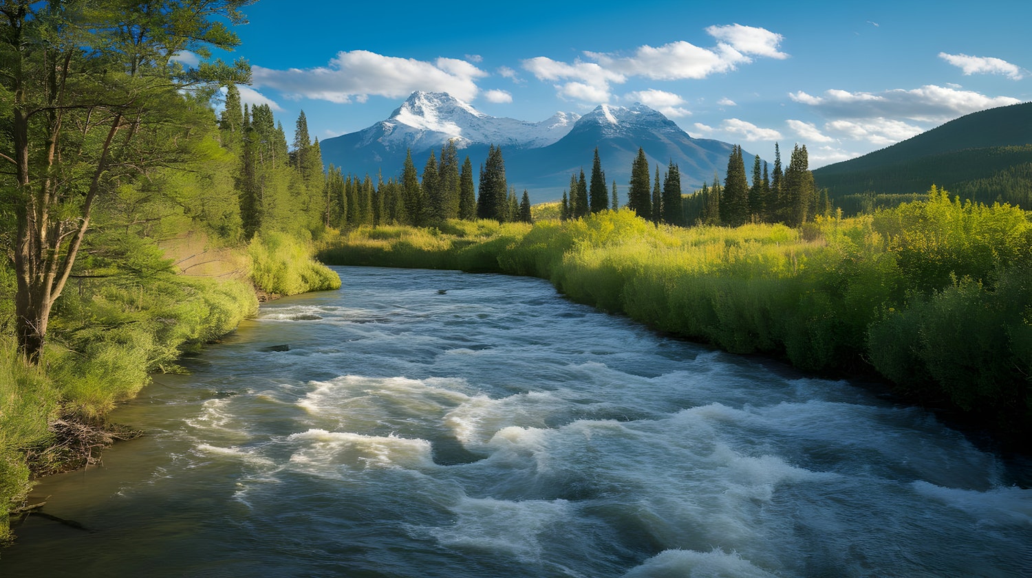 Breathtaking mountain river scene with lush greenery, snow-capped peaks, and a bright blue sky. Perfect for nature lovers and adventurers.