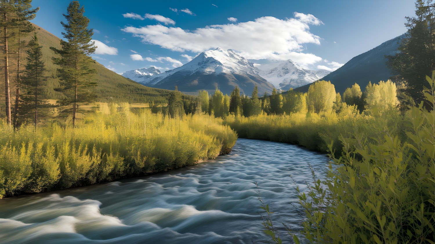 Breathtaking mountain view with a rushing river, lush greenery, and a snow-capped peak under a bright blue sky.