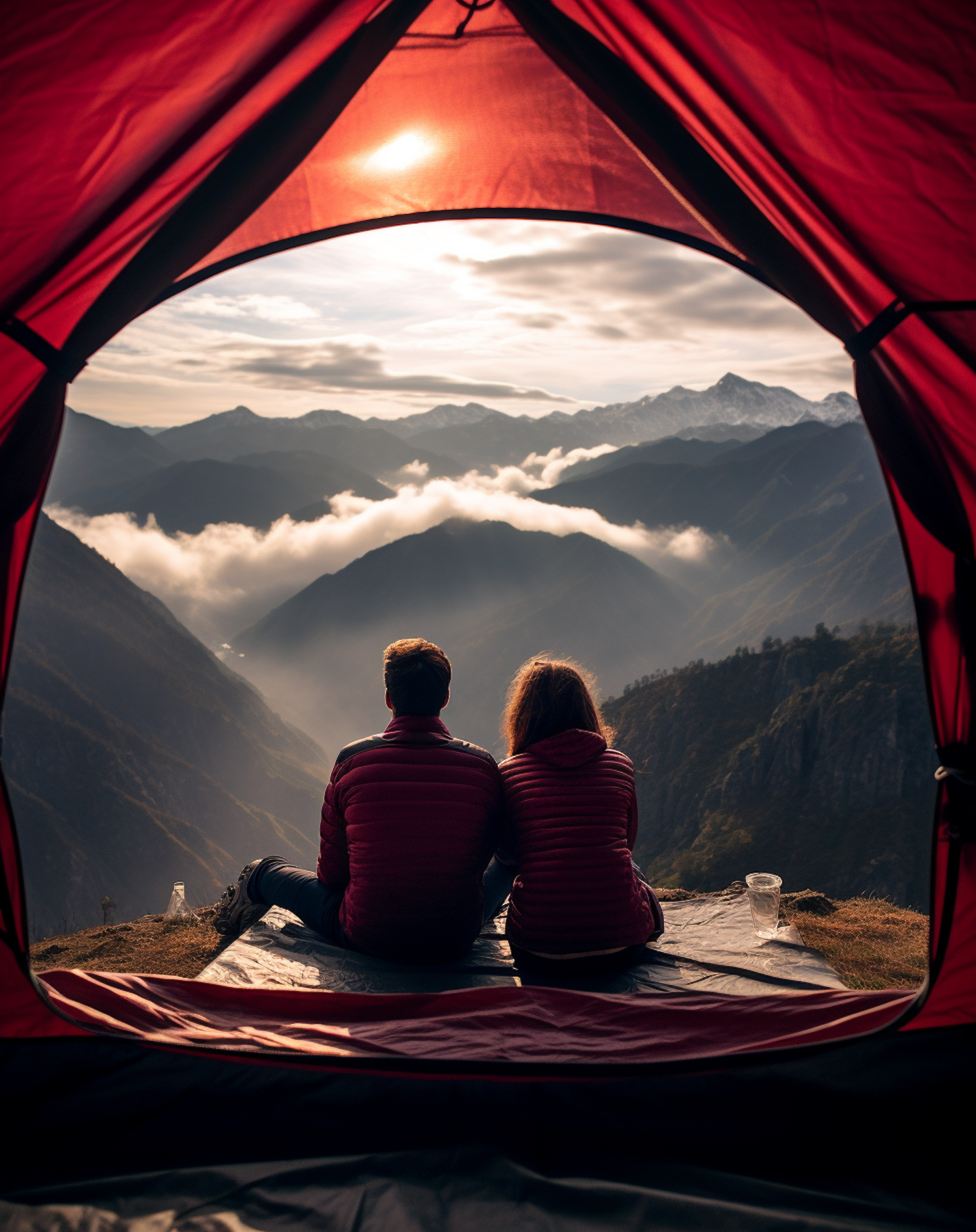 Couple in red jackets enjoys a stunning mountain view from a tent, with misty valleys and a warm sunrise.