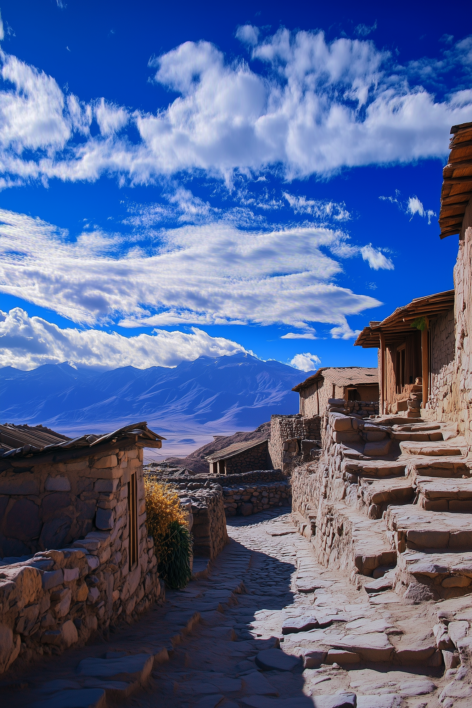 Rustic stone village with cobblestone path, set against majestic mountains and a vibrant blue sky with fluffy clouds.