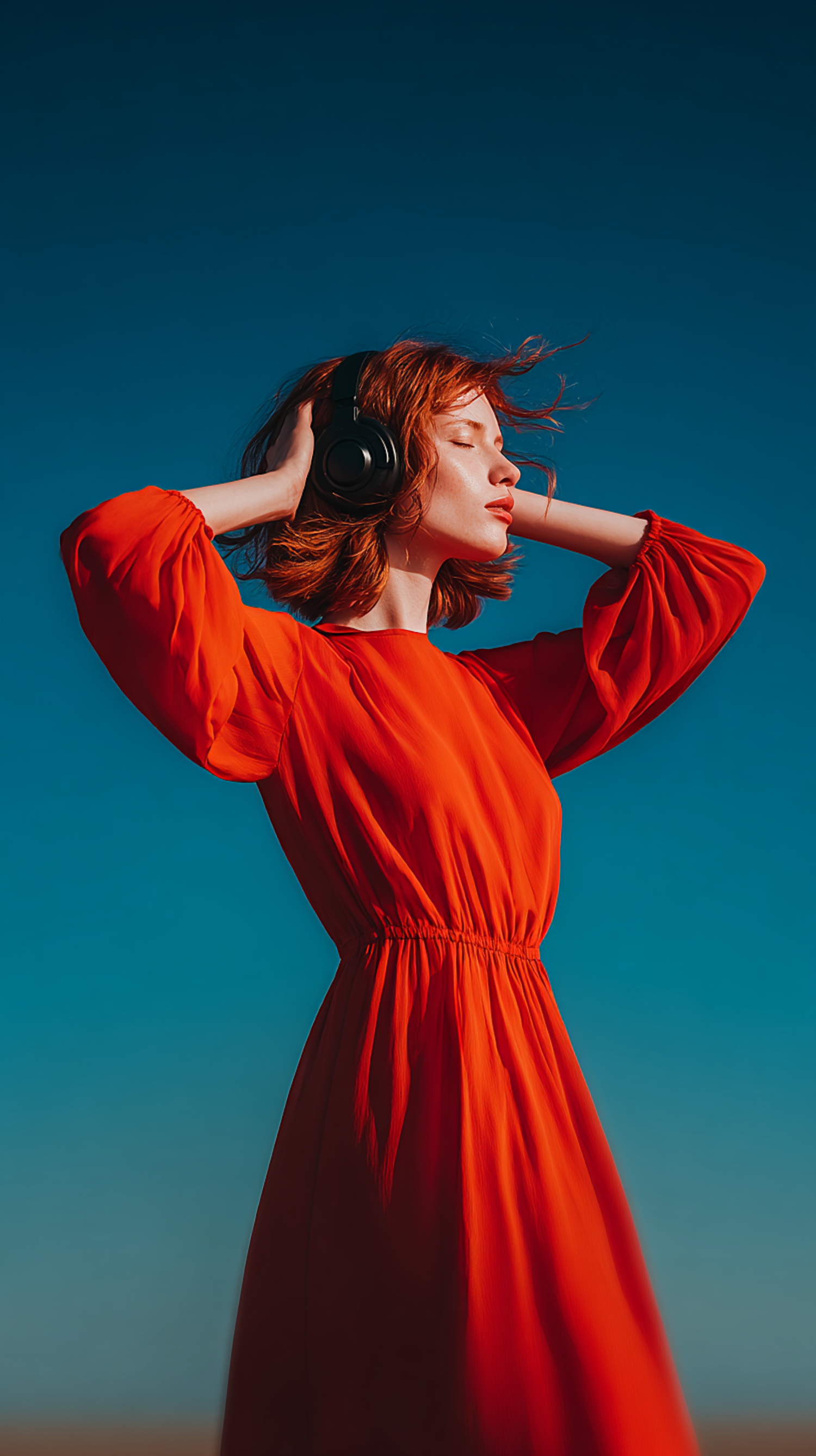A serene woman in a red dress enjoys music with headphones against a vibrant blue sky, creating a striking and colorful composition.