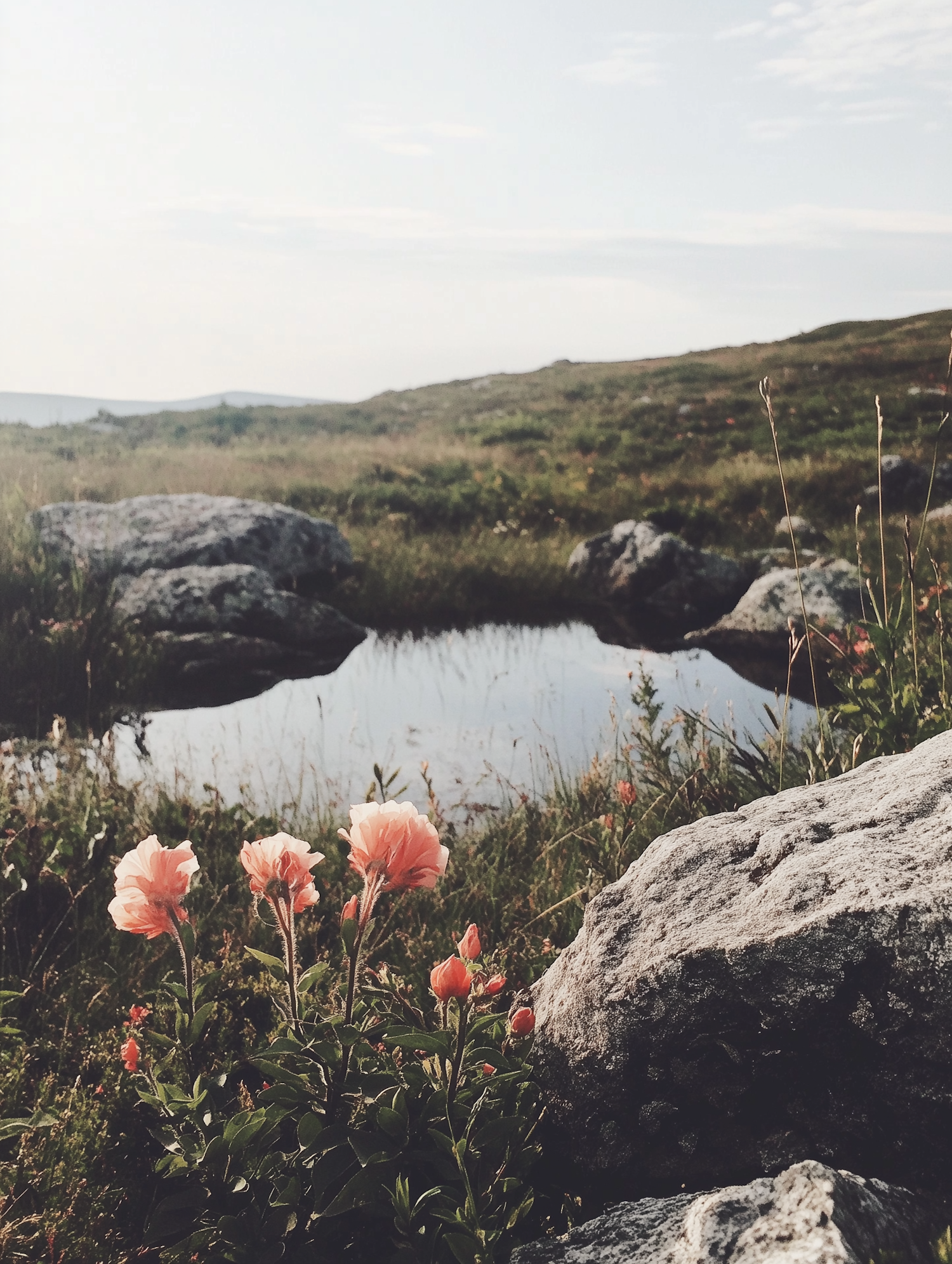 Serene landscape with pink flowers, rocks, and a reflective pond under a soft sky, creating a tranquil natural scene.