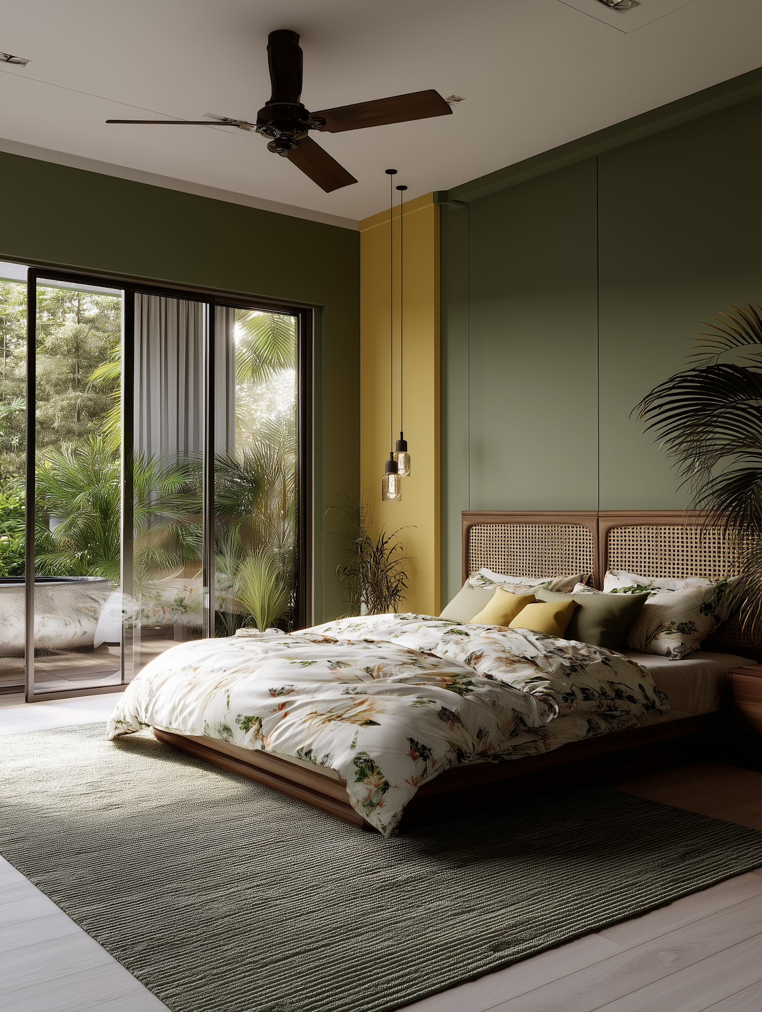 Cozy bedroom with green and yellow walls, floral bedding, rattan headboard, pendant lights, and a lush outdoor view through glass doors.