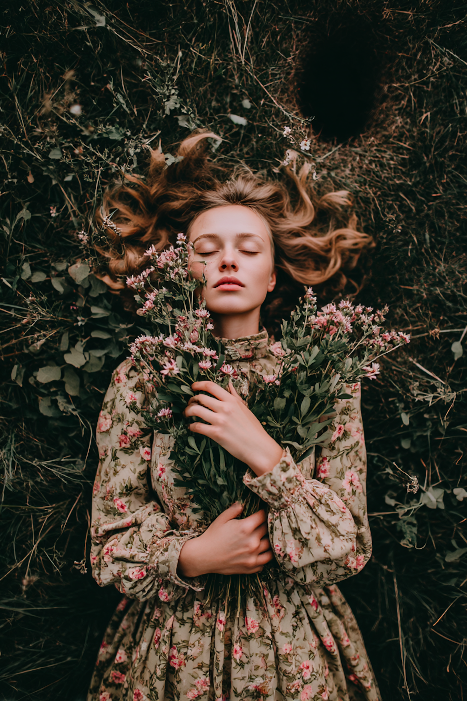A serene woman in a floral dress lies on grass, holding a bouquet of flowers, surrounded by natural tones and textures.