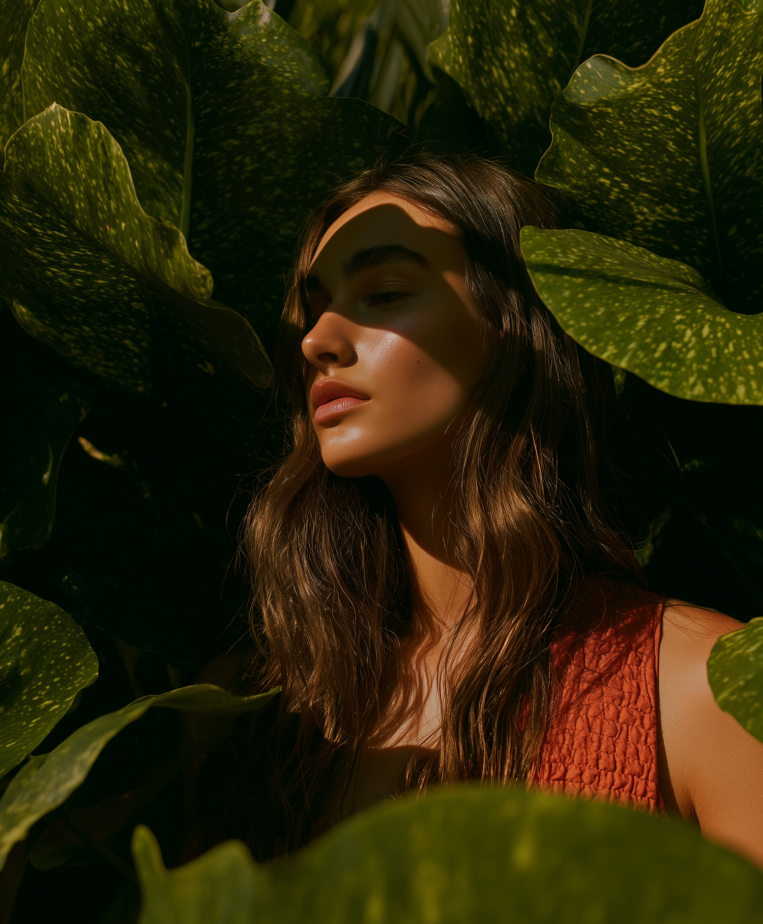 A serene portrait of a woman surrounded by lush green leaves, with sunlight casting intricate shadows on her face.
