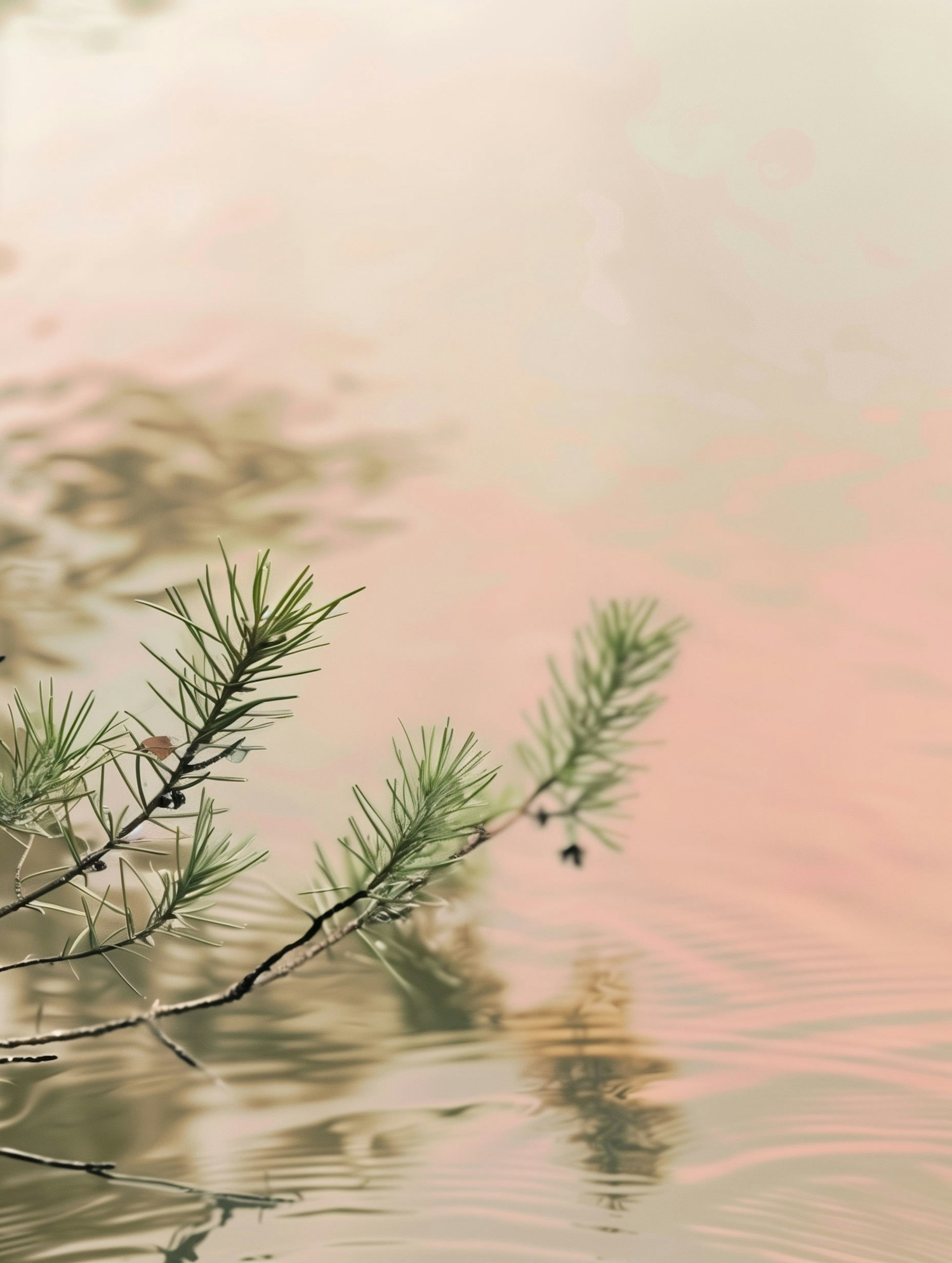 Serene pine branch over calm water with pastel reflections, creating a tranquil and minimalistic nature scene.