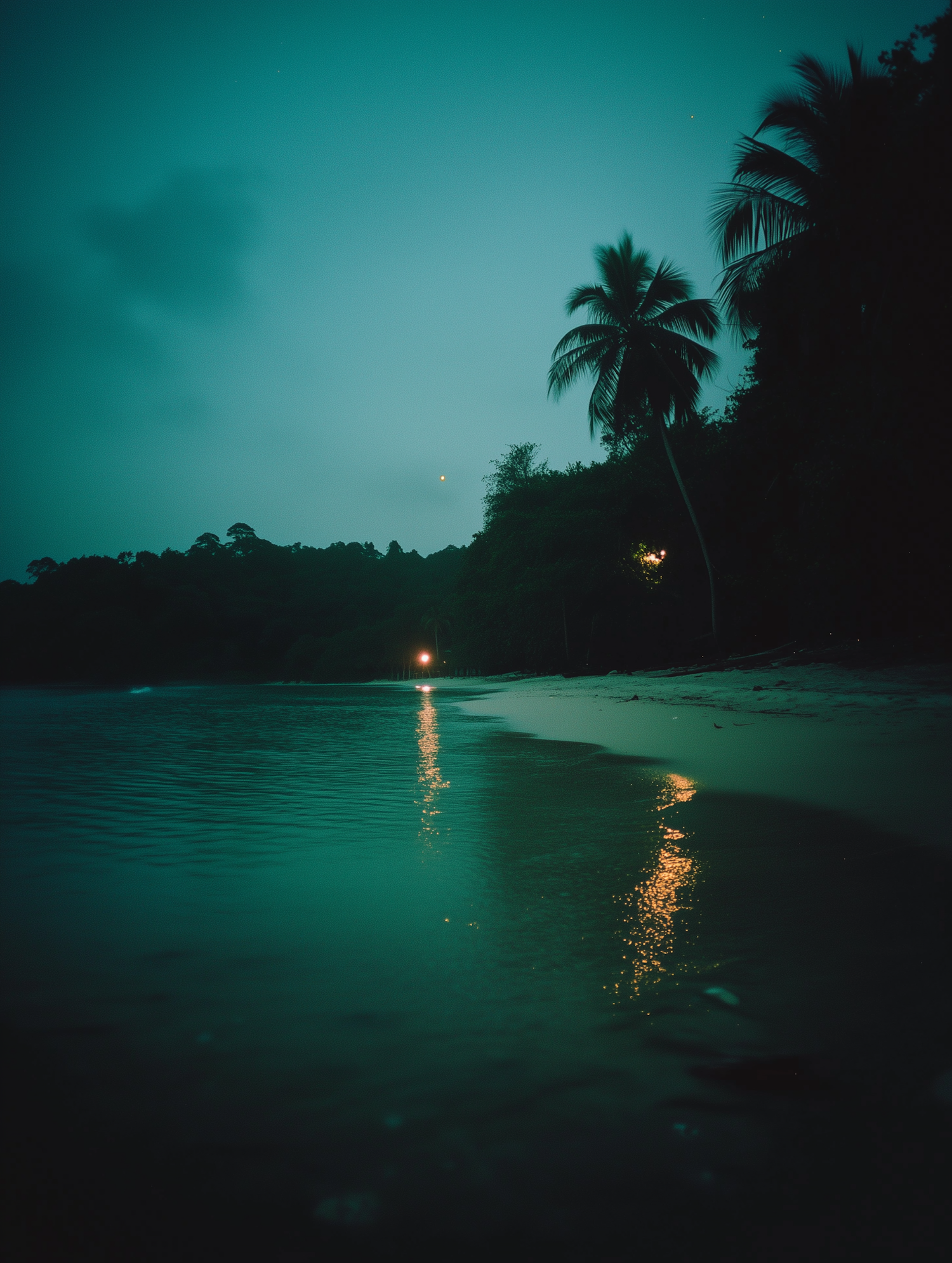 A tranquil nighttime beach with teal hues, palm silhouettes, and a golden light reflecting on the calm water. Perfect tropical serenity.