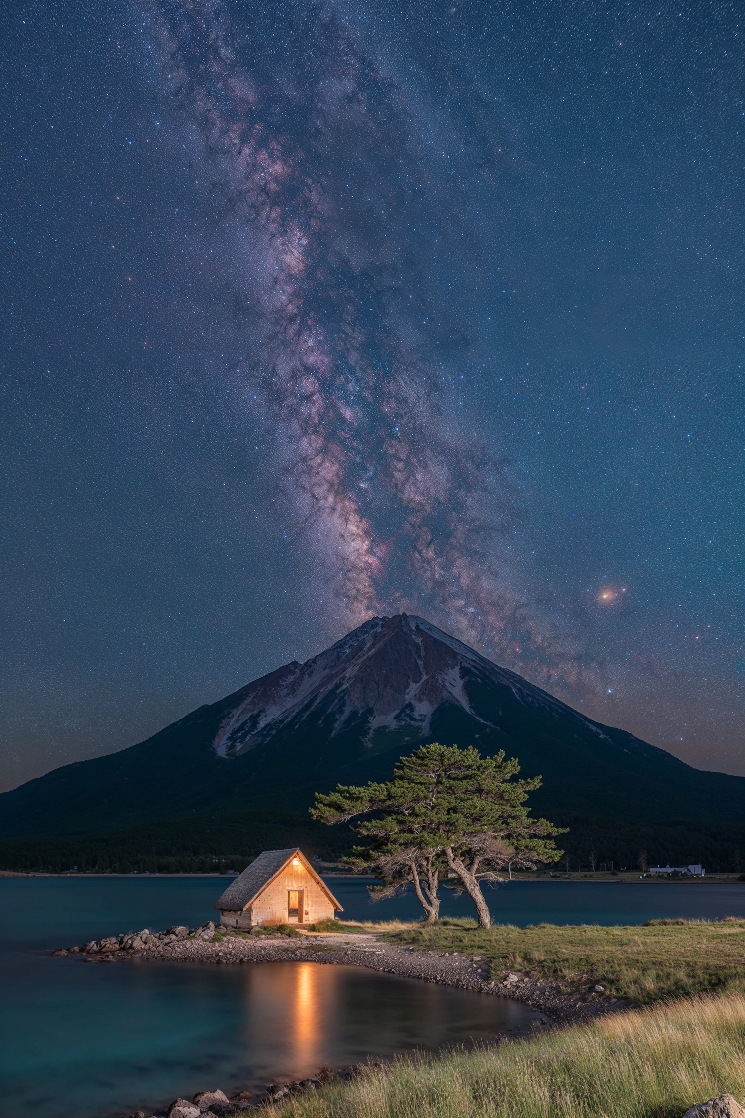 Stunning night scene with a cabin by a lake, a mountain backdrop, and the Milky Way illuminating the sky.