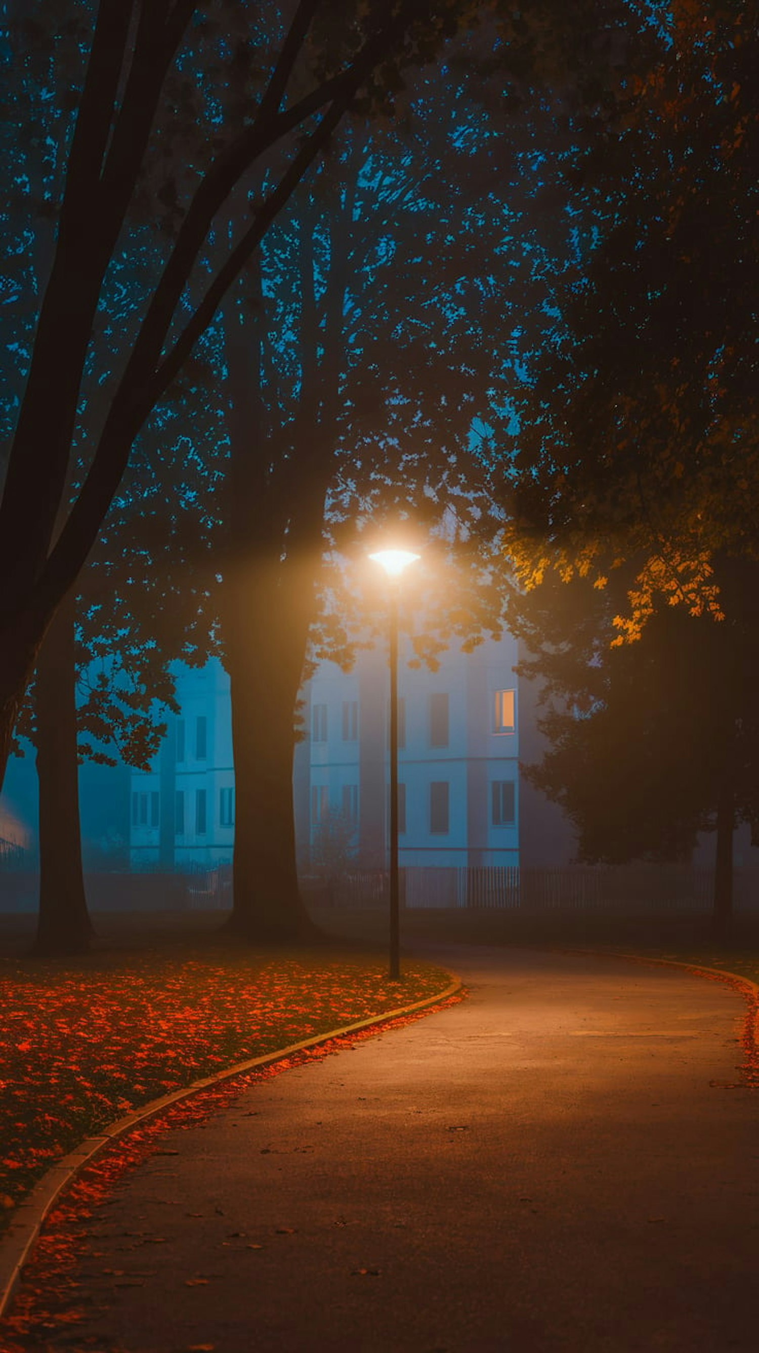 A misty park at night with a glowing streetlamp, autumn leaves on the path, and a distant building with lit windows.