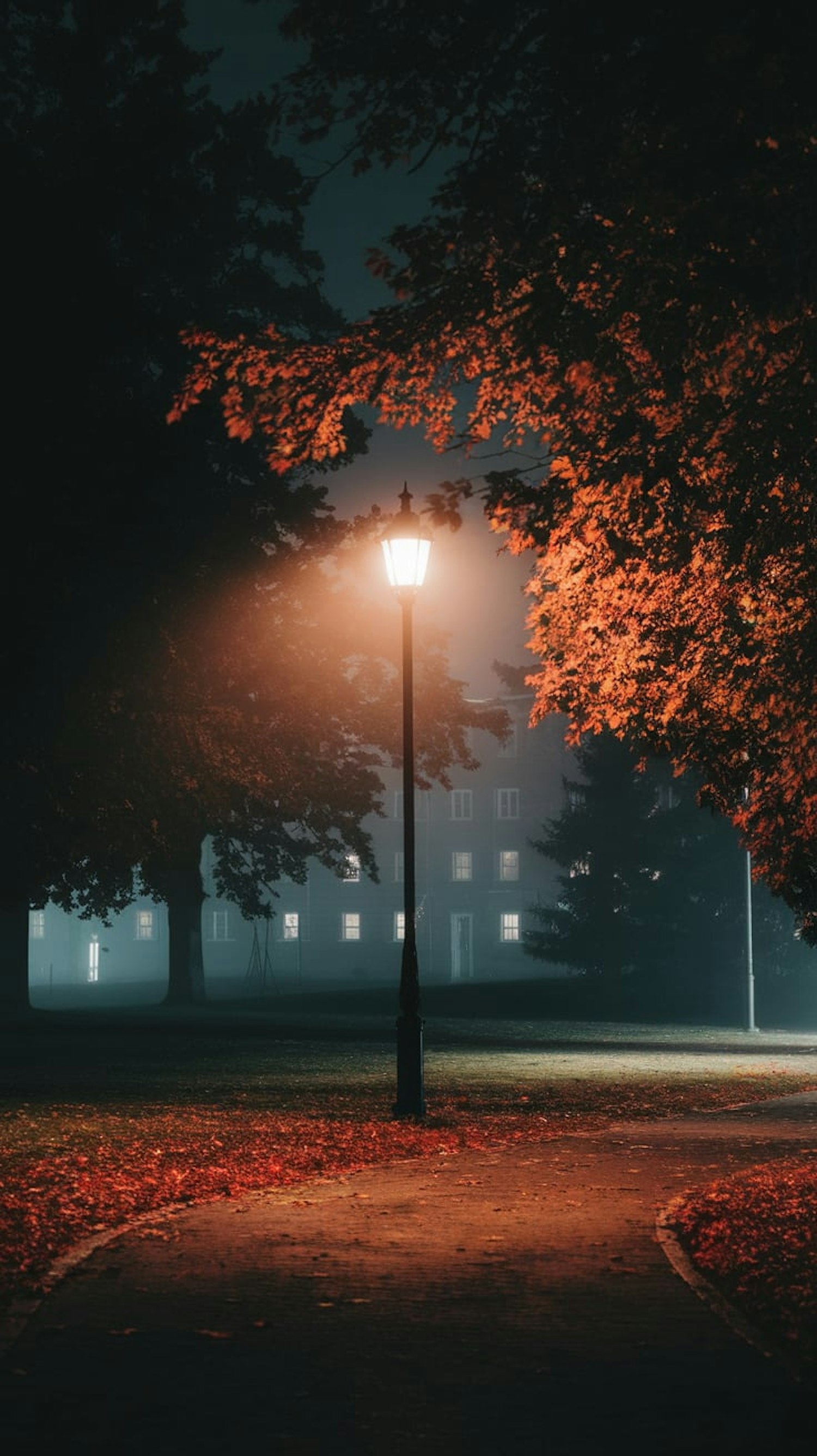 A glowing streetlamp lights up a misty autumn night, with vibrant orange leaves and a quiet building in the background.