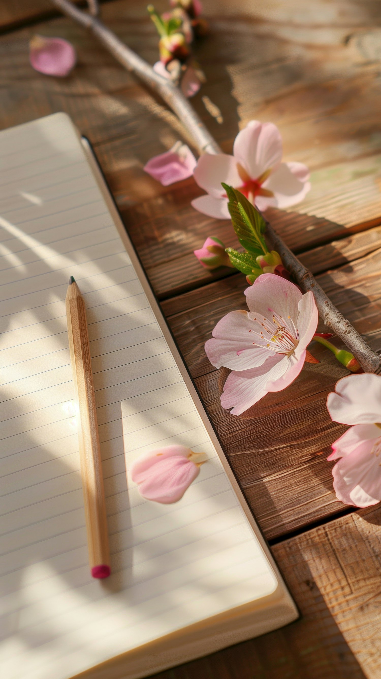 Serene scene with cherry blossoms, a notebook, and pencil on a wooden table, capturing a moment of tranquility and creativity.