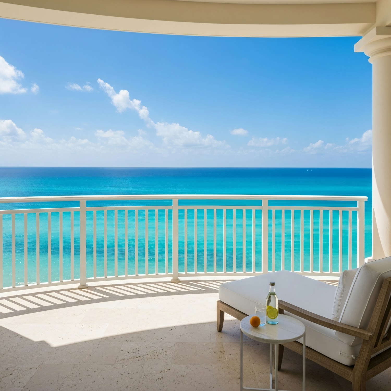 Relax on a sunny balcony with stunning ocean views, a cozy lounge chair, and refreshing drinks. Perfect for a peaceful getaway.
