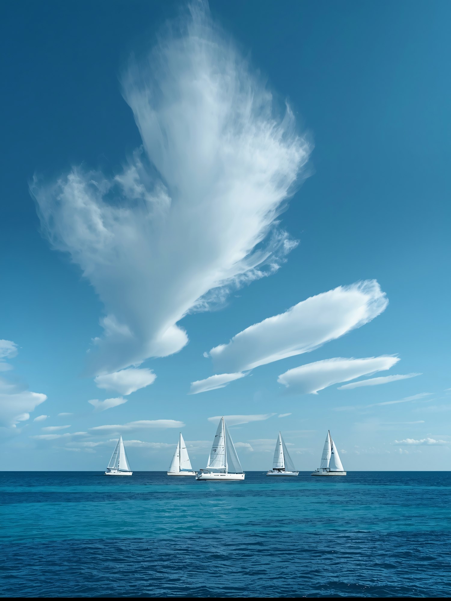 Five white sailboats on calm turquoise waters under a blue sky with wispy clouds, creating a serene and picturesque seascape.