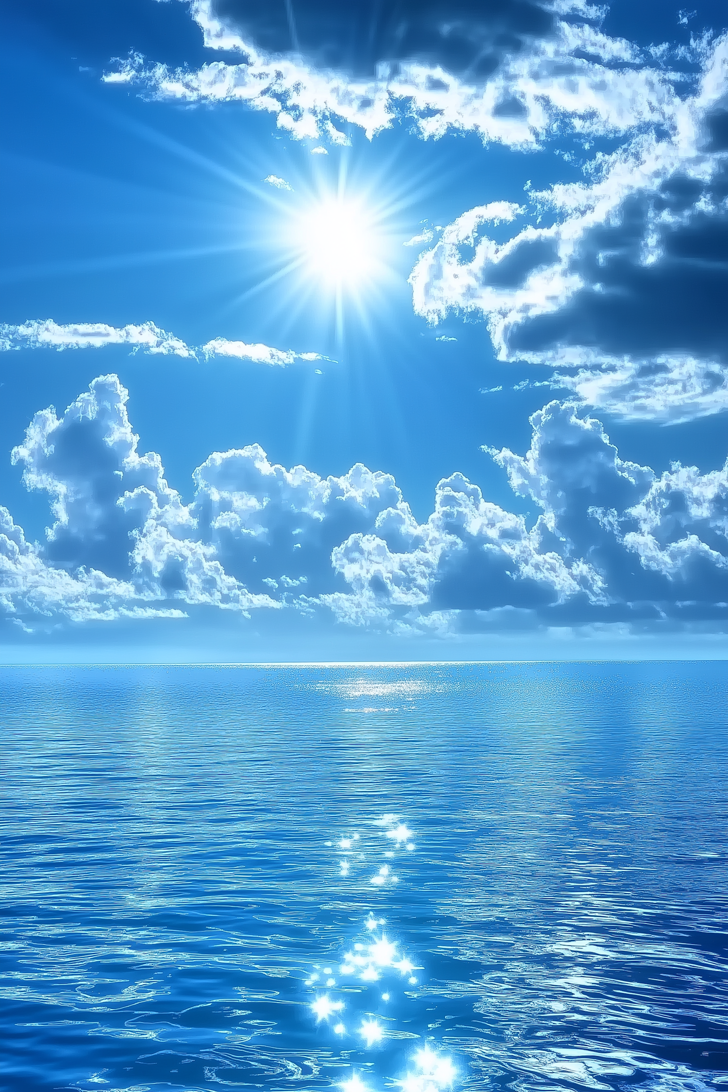 Bright sun over a calm ocean with sparkling reflections and fluffy clouds in a vibrant blue sky. A serene and peaceful seascape.
