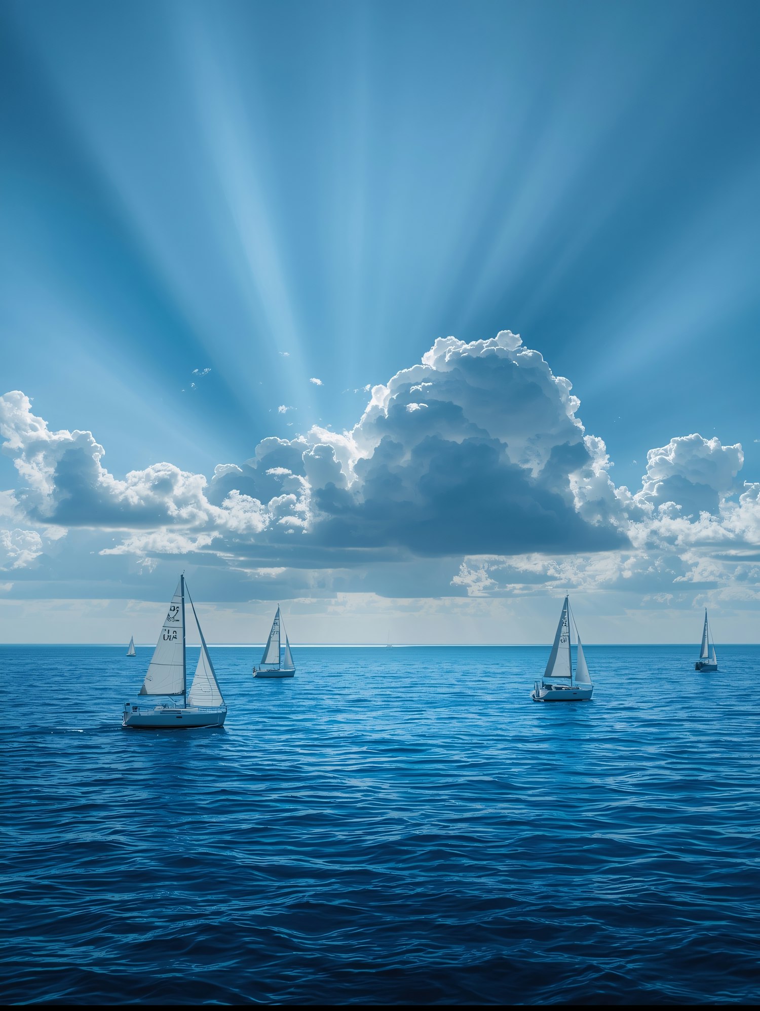 Sailboats glide on a calm blue ocean under a dramatic sky with sun rays breaking through fluffy clouds, creating a serene seascape.