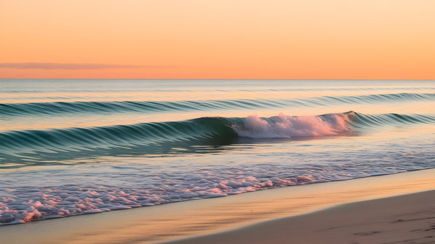 Serene ocean waves at sunset with soft pink and teal hues, breaking gently on a sandy shore under a pastel orange sky.