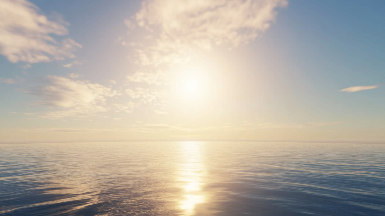 Serene ocean view with a golden sun reflecting on calm waters, under a soft blue sky with wispy clouds.